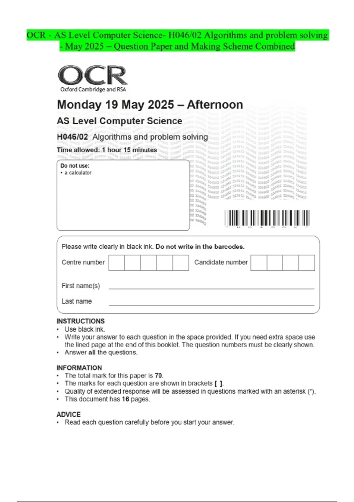 OCR - AS Level Computer Science- H446/01 Computer systemsMay 2025 – Question Paper and Making Scheme Combined