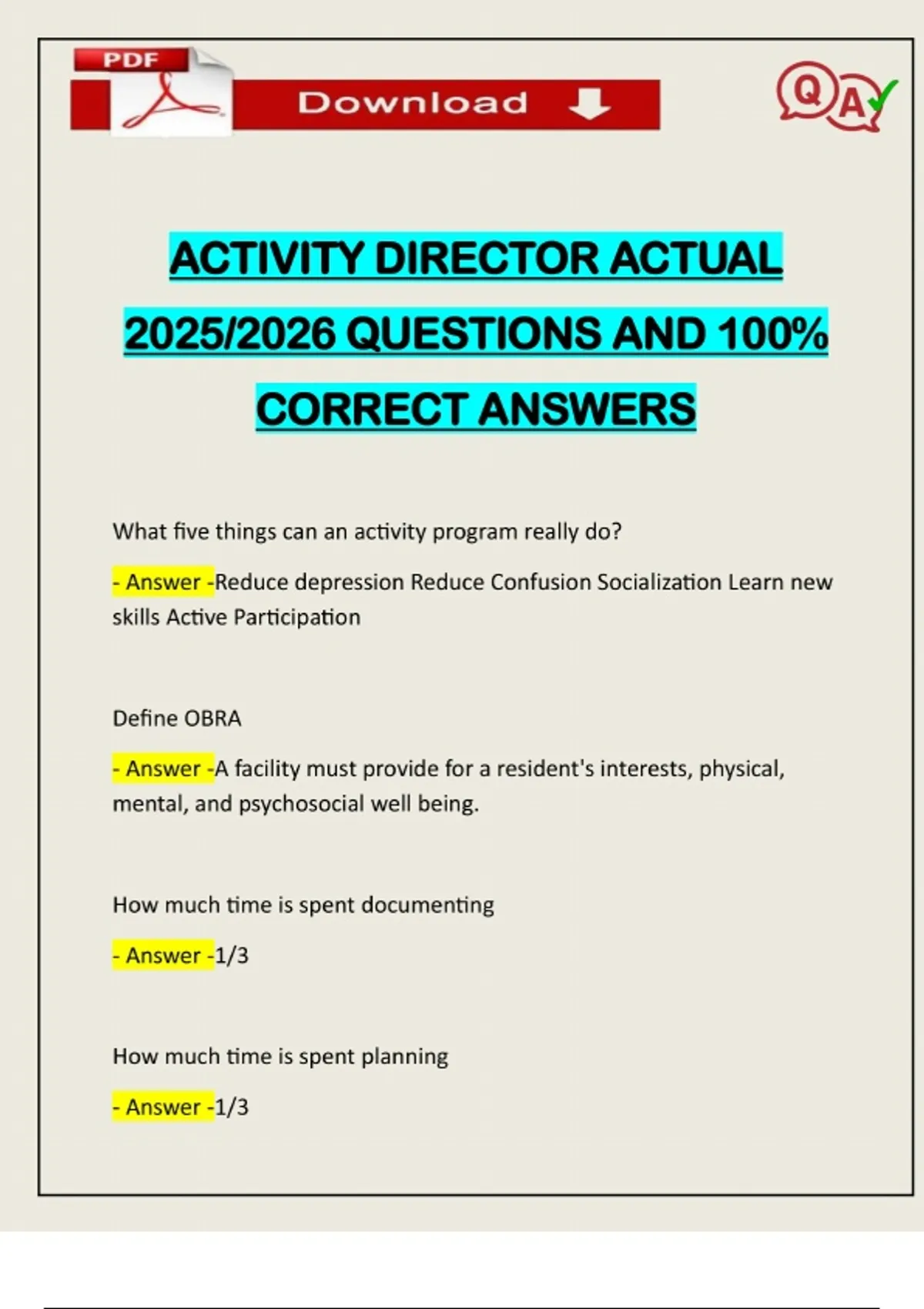 ACTIVITY DIRECTOR ACTUAL 2025/2026 QUESTIONS AND 100% CORRECT ANSWERS What five things can an activity program really do? - Answer -Reduce depression Reduce Confusion Socialization Learn new skills Active Participation Define OBRA - Answer -A facility must provide for a resident's interests, physical, mental, and psychosocial well being. How much time is spent documenting - Answer -1/