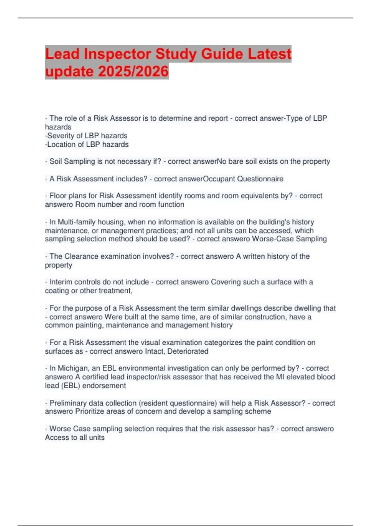 Prepare confidently for the Lead Inspector Certification Exam with this fully updated 2025/2026 study guide. Covers all key topics including lead inspection procedures, risk assessment, sampling methods, safety regulations, mitigation strategies, and federal/state compliance. Includes realistic practice questions with verified answers to reinforce learning and ensure exam success. Ideal for environmental professionals, contractors, and inspectors seeking fast, effective certification prep with a 100% pass guarantee.