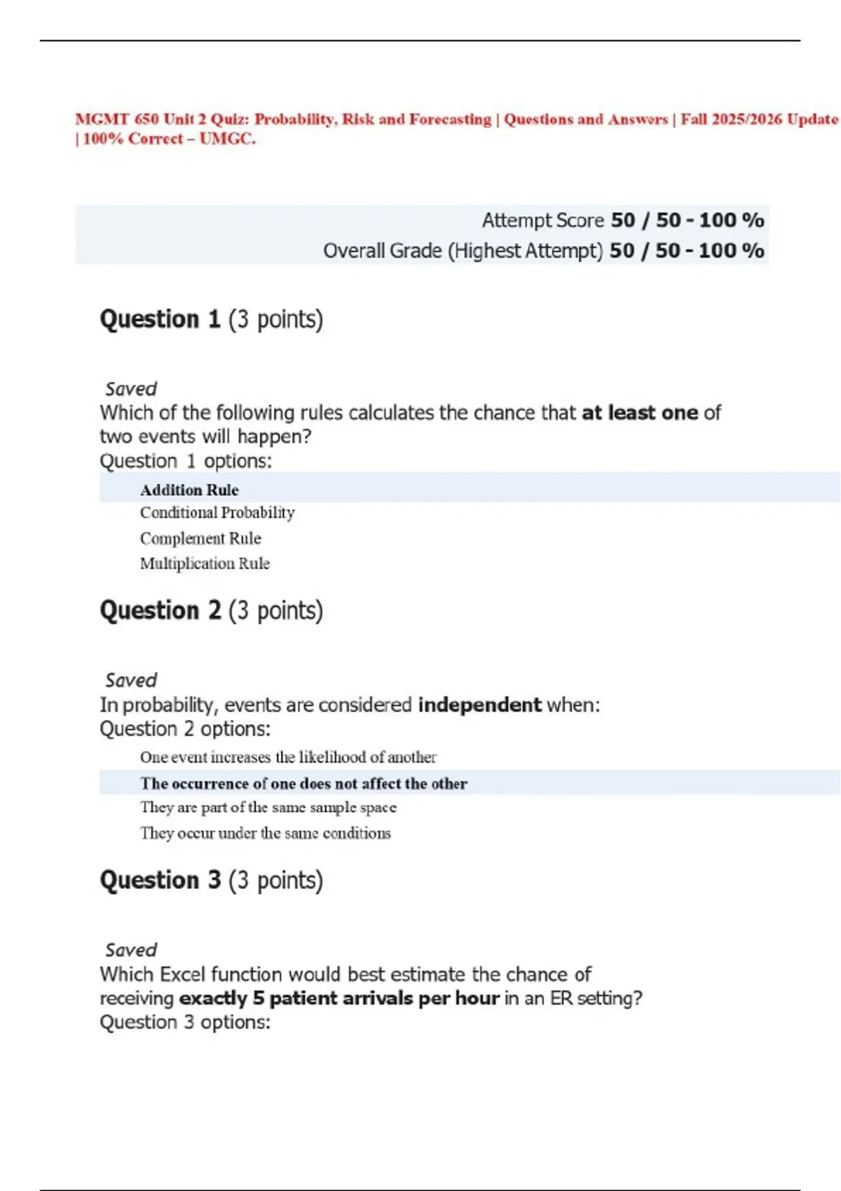 MGMT 650 Unit 2 Quiz: Probability, Risk and Forecasting | Questions and Answers | Fall 2025/2026 Update | 100% Correct – UMGC.