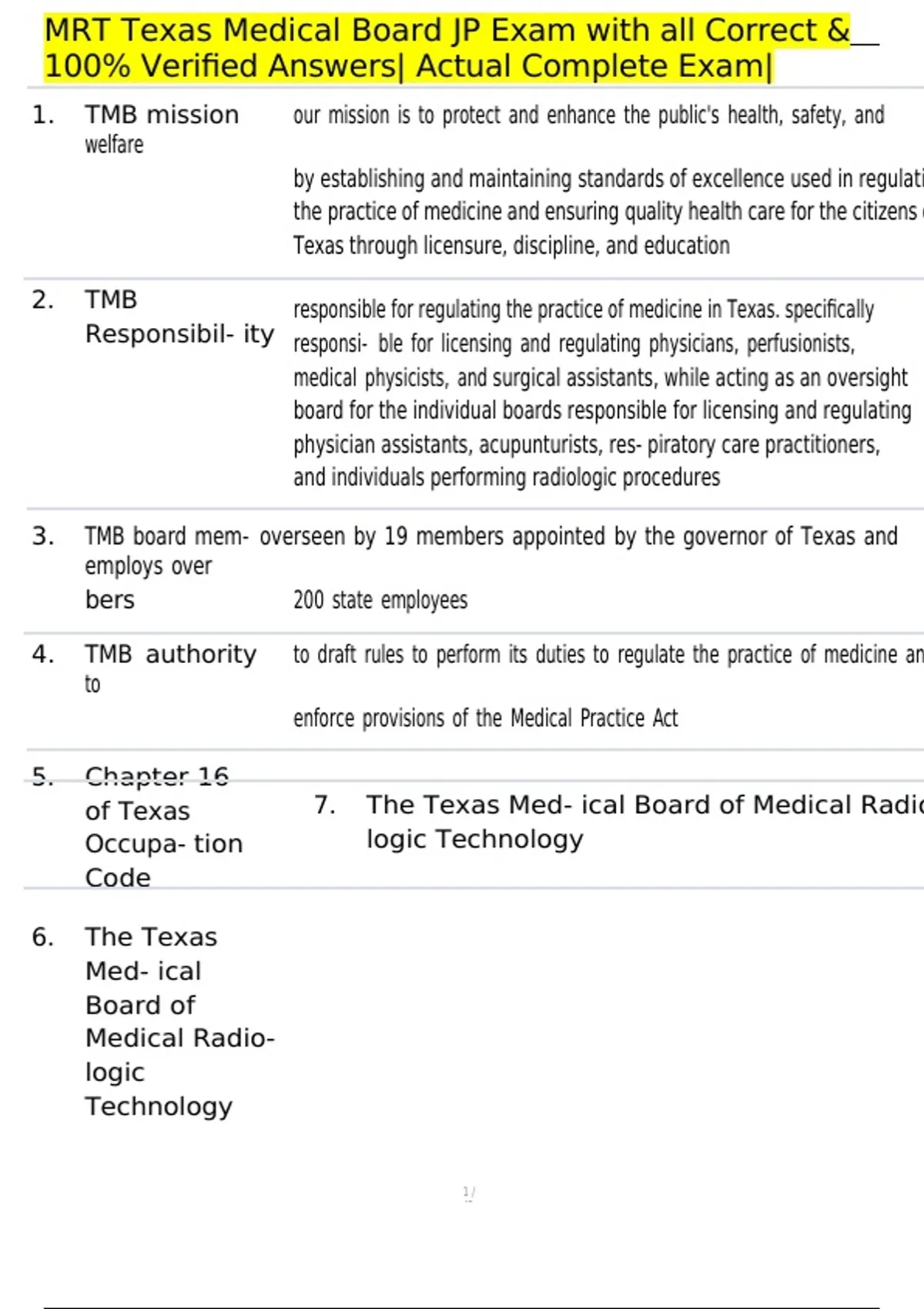 MRT Texas Medical Board JP Exam with all Correct &