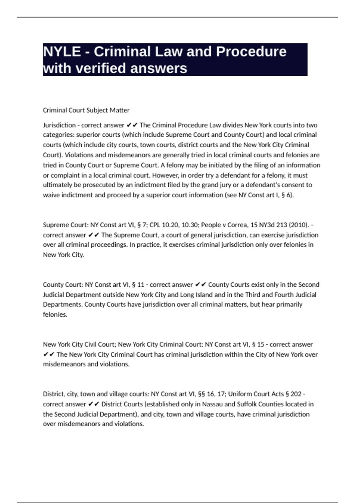 Jurisdiction - correct answer ✔✔ The Criminal Procedure Law divides New York courts into two