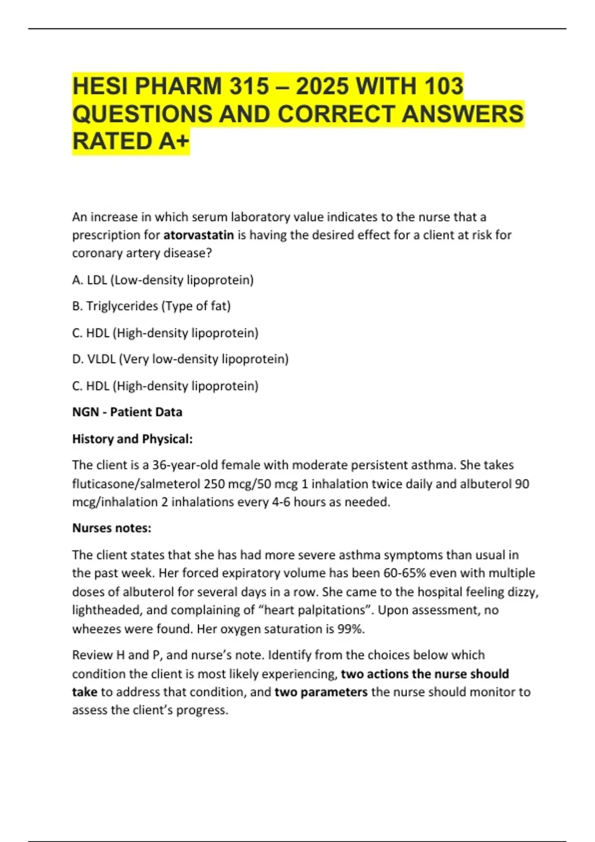 HESI PHARM 315 – 2025 WITH 103 QUESTIONS AND CORRECT ANSWERS RATED A+ HESI PHARM 315 – 2025 WITH 103 QUESTIONS AND CORRECT ANSWERS RATED A+