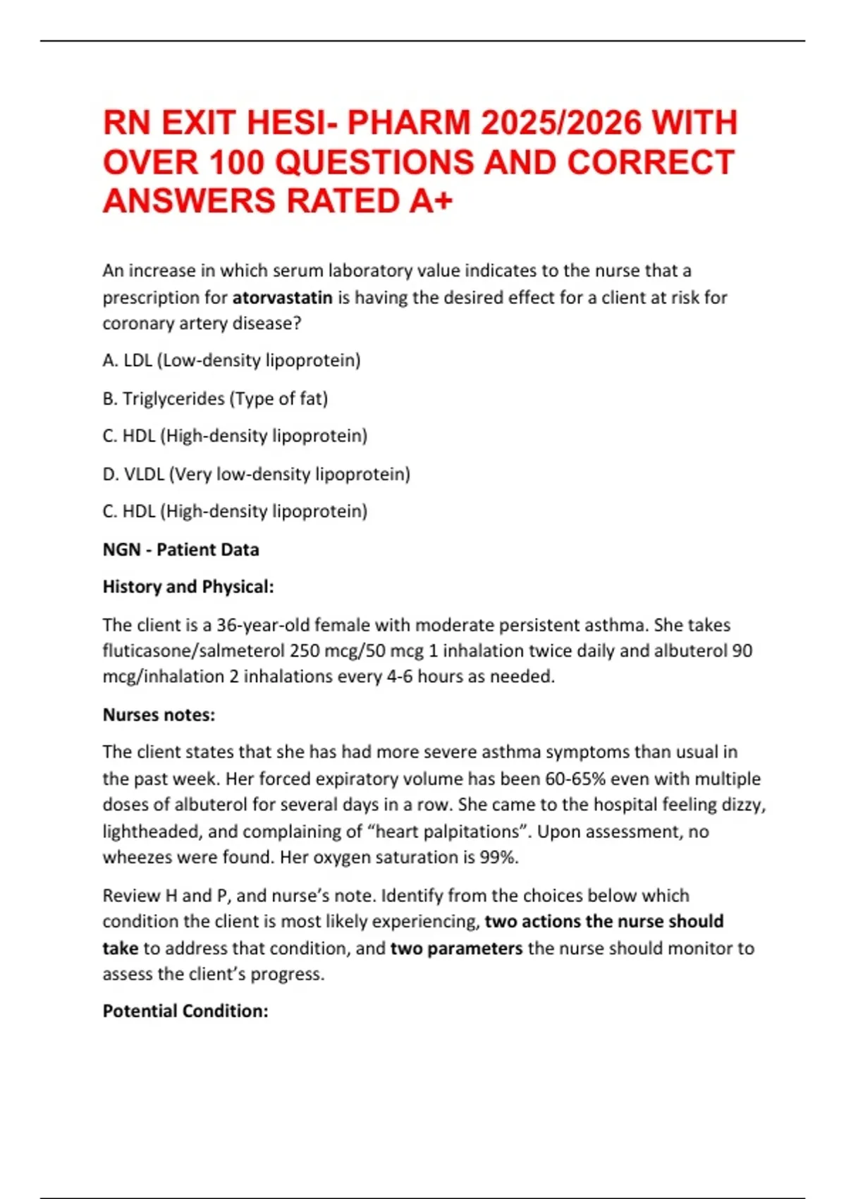 RN EXIT HESI- PHARM 2025/2026 WITH OVER 100 QUESTIONS AND CORRECT ANSWERS RATED A+ RN EXIT HESI- PHARM 2025/2026 WITH OVER 100 QUESTIONS AND CORRECT ANSWERS RATED A+