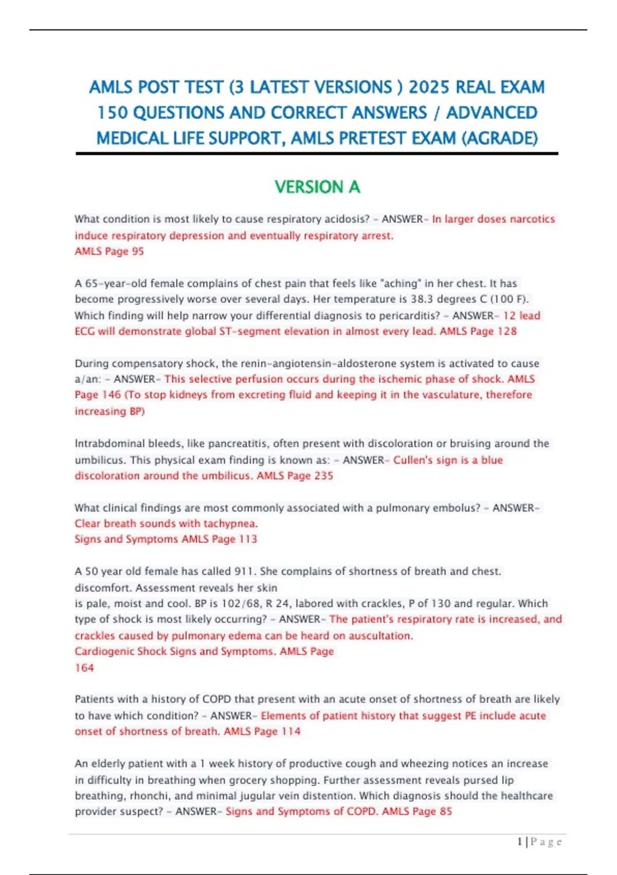 The AMLS Post Test 2025 includes the three latest versions with a total of 150 real exam questions and correct answers. This resource also provides the AMLS Pretest (A Grade) for accurate and comprehensive preparation. Designed for students and providers in Advanced Medical Life Support, it delivers reliable exam-style practice to strengthen knowledge, improve confidence, and ensure readiness for AMLS certification assessments.