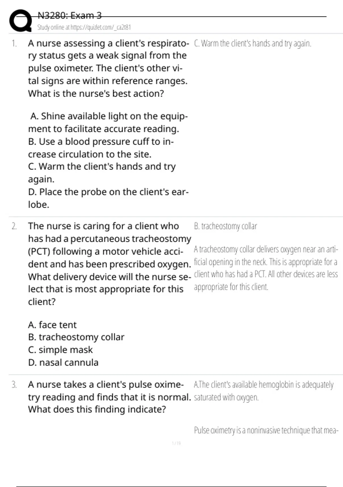 1. A nurse assessing a client's respirato- C. Warm the client's hands and try again.