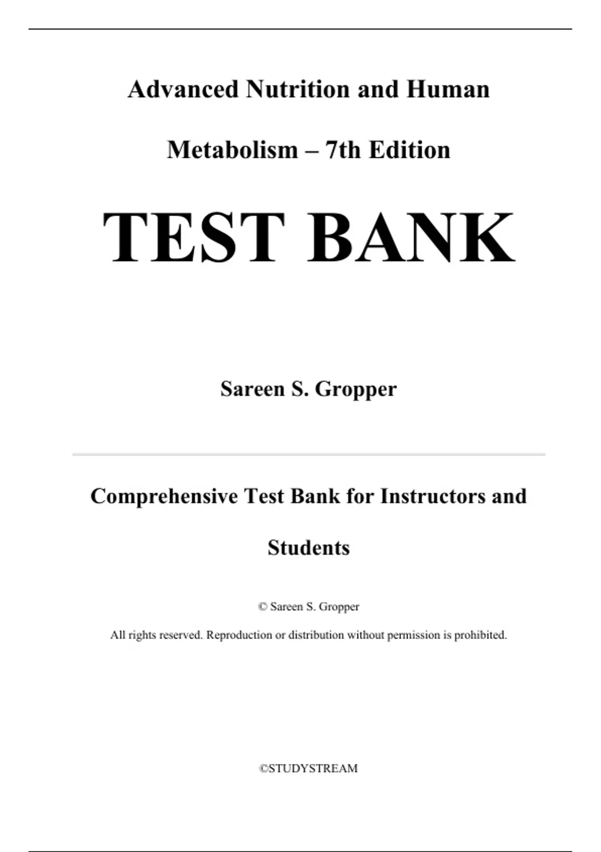 Test Bank for Advanced Nutrition and Human Metabolism, 7th Edition by Gropper. Full Chapters include;....SECTION I: CELLS AND THEIR NOURISHMENT. 1. The Cell: A Microcosm of Life. 2. The Digestive System: Mechanism for Nourishing the Body. SECTION II: MACRONUTRIENTS AND THEIR METABOLISM. 3. Carbohydrates. 4. Fiber. 5. Lipids. 6. Protein. 7. Integration and Regulation of Metabolism and the Impact of Exercise. 8. Energy Expenditure, Body Composition and Healthy Weight. SECTION III: THE REGULATORY NUTRIENTS. 9. The Water-Soluble Vitamins. 10. The Fat-Soluble Vitamins. 11. Major Minerals. 12. Water and Electrolytes. 13. Essential Trace and Ultratrace Minerals. 14. Nonessential Trace and Ultratrace Minerals.