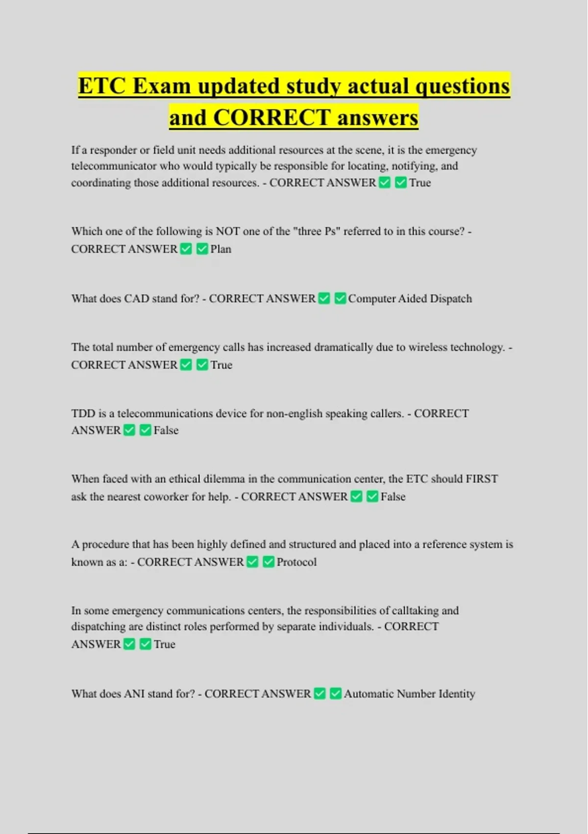ETC Exam updated study actual questions and CORRECT answers If a responder or field unit needs additional resources at the scene, it is the emergency telecommunicator who would typically be responsible for locating, notifying, and coordinating those additional resources. - CORRECT ANSWER True Which one of the following is NOT one of the "three Ps" referred to in this course? - CORRECT ANSWER Plan What does CAD stand for? - CORRECT ANSWER Computer Aided Dispatch The total number of emergency calls has increased dramatically due to wireless technology. - CORRECT ANSWER True TDD is a telecommunications device for non-english speaking callers. - CORRECT ANSWER False When faced with an ethical dilemma in the communication center, the ETC should FIRST ask the nearest coworker for help. - CORRECT ANSWER False