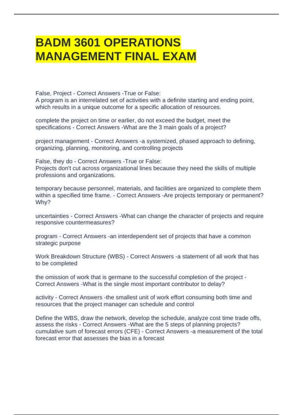 BADM 3601 OPERATIONS MANAGEMENT FINAL EXAM QUESTIONS WITH CORRECT ANSWERS
