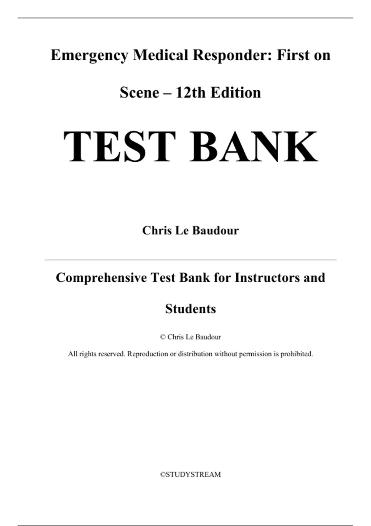 Test Bank for Emergency Medical Responder: First on Scene, 12th edition by Chris Le Baudour. Full Chapters Include;....Introduction to EMS Systems Legal and Ethical Principles of Emergency Care Wellness and Safety of the Emergency Medical Responder Introduction to Medical Terminology, Human Anatomy, and Lifespan Development Introduction to Pathophysiology Principles of Lifting, Moving, and Positioning of Patients Principles of Effective Communication Principles of Effective Documentation Principles of Airway Management and Ventilation Principles of Oxygen Therapy Principles of Resuscitation Obtaining a Medical History and Vital Signs Principles of Patient Assessment Caring for Cardiac Emergencies Caring for Respiratory Emergencies Caring for Common Medical Emergencies Caring for Environmental Emergencies Caring for Soft Tissue Injuries and Bleeding Recognition and Care of Shock Caring for Muscle and Bone Injuries Caring for Head and Spinal Injuries Caring for Chest and Abdominal Emergencies Care During Pregnancy and Childbirth Caring for Infants and Children Special Considerations for the Geriatric Patient Introduction to EMS Operations and Hazardous Response Introduction to Multiple-Casualty Incidents, the Incident Command System, and Triage