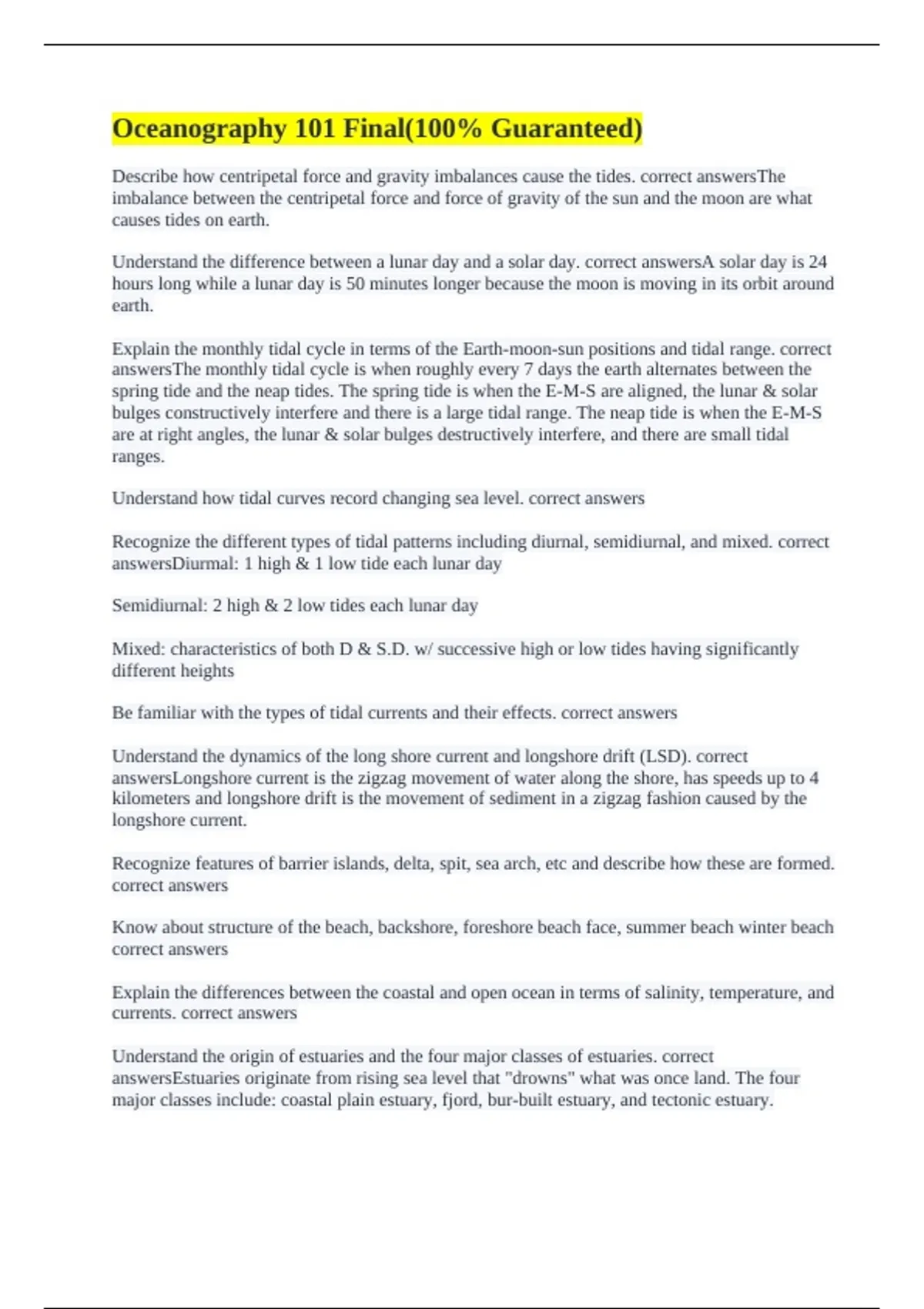 Describe how centripetal force and gravity imbalances cause the tides. correct answersThe imbalance between the centripetal force and force of gravity of the sun and the moon are what causes tides on earth. Understand the difference between a lunar day and a solar day. correct answersA solar day is 24 hours long while a lunar day is 50 minutes longer because the moon is moving in its orbit around earth. Explain the monthly tidal cycle in terms of the Earth-moon-sun positions and tidal range. correct answersThe monthly tidal cycle is when roughly every 7 days the earth alternates between the spring tide and the neap tides. The spring tide is when the E-M-S are aligned, the lunar & solar bulges constructively interfere and there is a large tidal range. The neap tide is when the E-M-S are at right angles, the lunar & solar bulges destructively interfere, and there are small tidal ranges. Understand how tidal curves record changing sea level. correct answers Recognize the different types of tidal patterns including diurnal, semidiurnal, and mixed. correct answersDiurmal: 1 high & 1 low tide each lunar day Semidiurnal: 2 high & 2 low tides each lunar day Mixed: characteristics of both D & S.D. w/ successive high or low tides having significantly different heights Be familiar with the types of tidal currents and their effects. correct answers Understand the dynamics of the long shore current and longshore drift (LSD). correct answersLongshore current is the zigzag movement of water along the shore, has speeds up to 4 kilometers and longshore drift is the movement of sediment in a zigzag fashion caused by the longshore current. Recognize features of barrier islands, delta, spit, sea arch, etc and describe how these are formed. correct answers Know about structure of the beach, backshore, foreshore beach face, summer beach winter beach correct answers Explain the differences between the coastal and open ocean in terms of salinity, temperature, and currents. correct answers Understand the origin of estuaries and the four major classes of estuaries. correct answersEstuaries originate from rising sea level that "drowns" what was once land. The four major classes include: coastal plain estuary, fjord, bur-built estuary, and tectonic estuary.