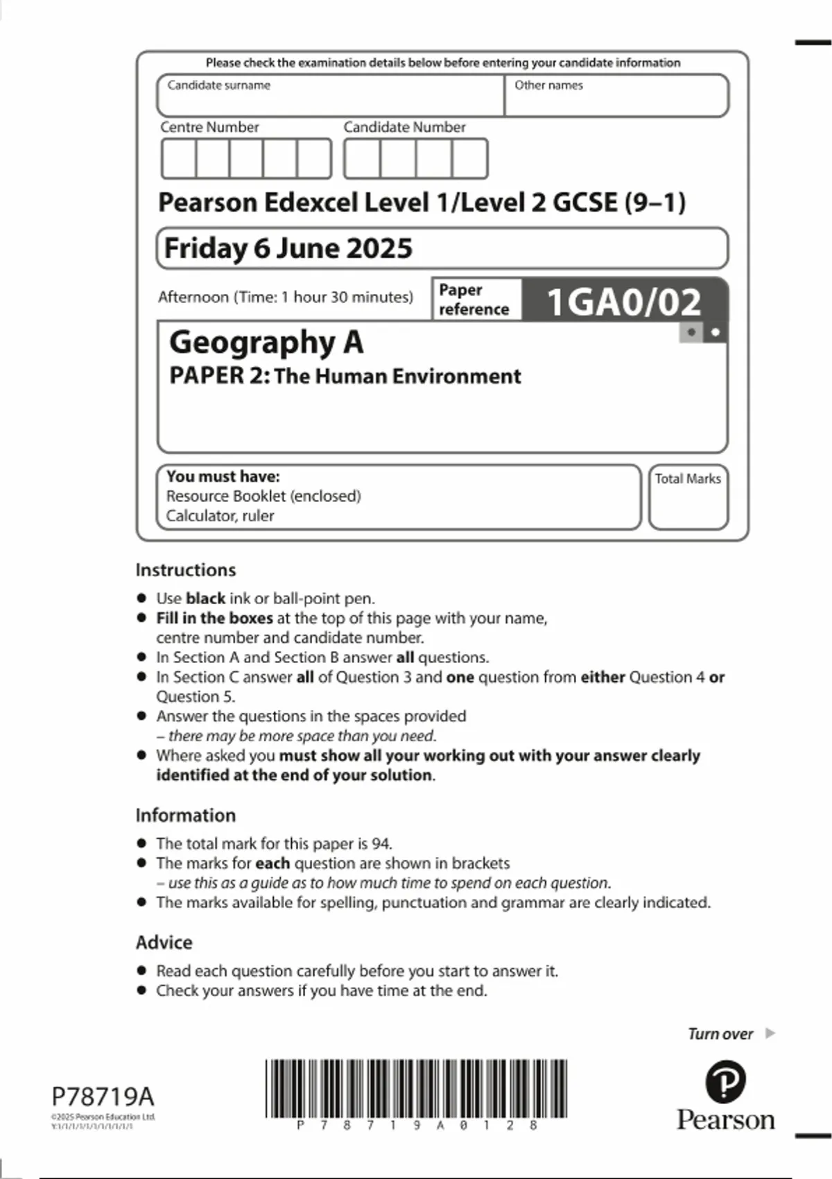 2025 Pearson Edexcel GCSE Geography A PAPER QUESTION PAPER (1GA0/02 : The Human Environment (1GA0/02