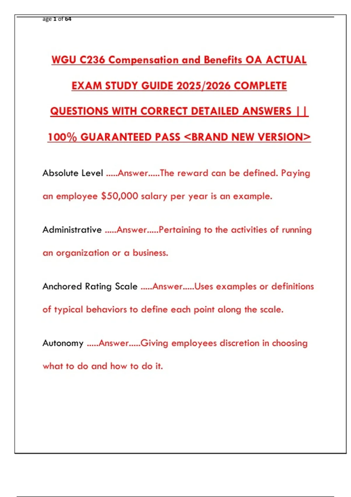 Prepare for the WGU C236 Compensation and Benefits Objective Assessment with this actual exam study guide. Includes key topics, potential exam questions, and comprehensive review materials on job analysis, pay structures, benefits administration, and legal compliance to help you pass.