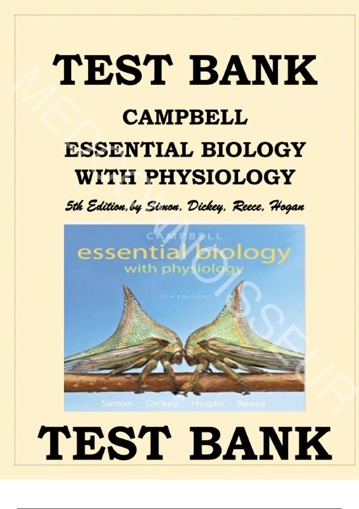 This document contains the complete test bank for Campbell Essential Biology with Physiology (5th Edition) by Simon, Dickey, Reece, and Hogan. It features hundreds of multiple-choice questions organized by chapter and unit, with correct answers provided. Topics include cell biology, genetics, evolution, ecology, and physiology, making it ideal for introductory biology courses in college or high school. This resource is aligned with the textbook structure and supports exam preparation, quizzes, and concept reinforcement.