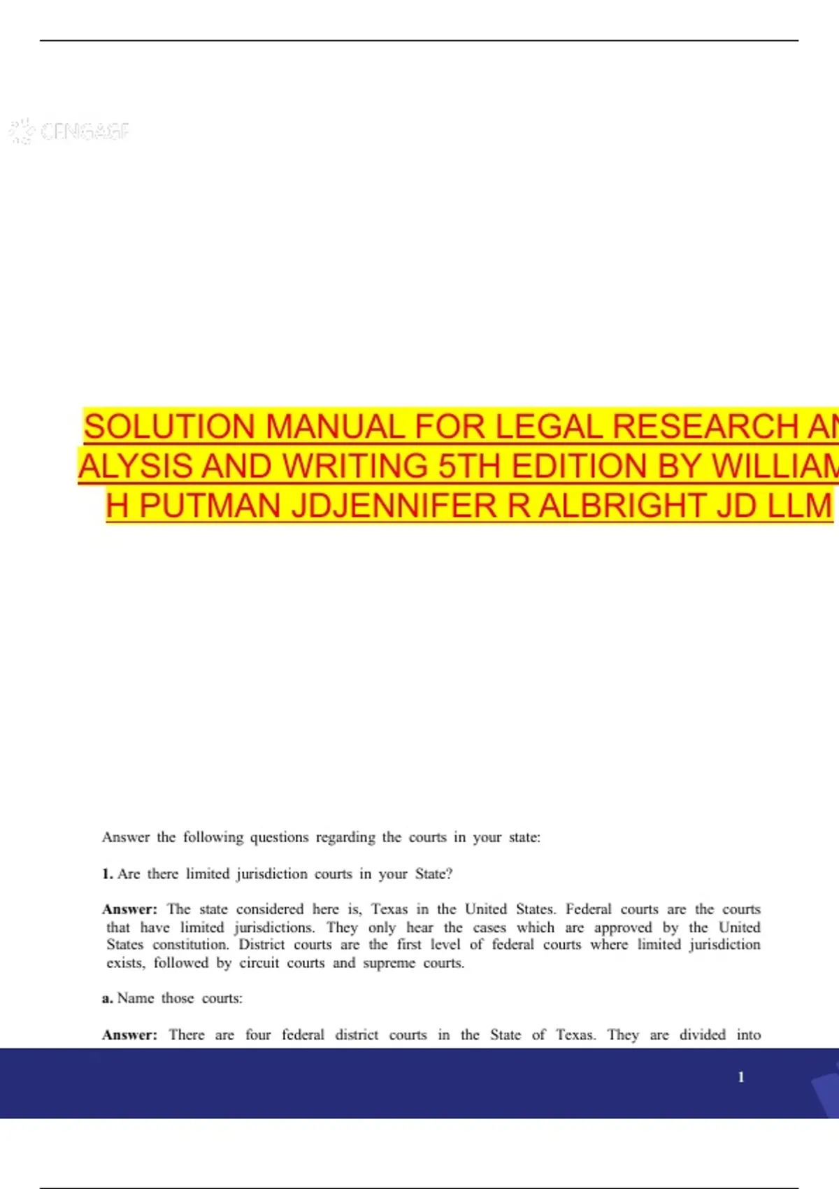 SOLUTION MANUAL FOR LEGAL RESEARCH ANALYSIS AND WRITING 5TH EDITION BY WILLIAM H PUTMAN JDJENNIFER R ALBRIGHT JD LLM