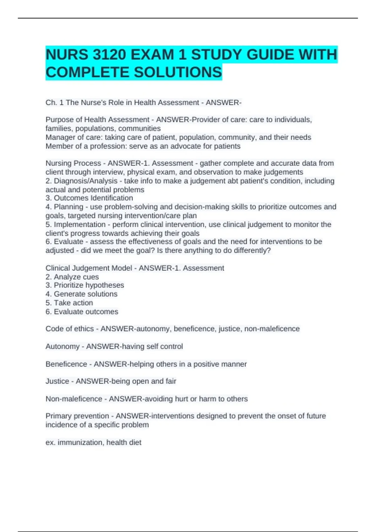 NURS 3120 EXAM 1 STUDY GUIDE WITH COMPLETE SOLUTIONSNURS 3120 EXAM 1 STUDY GUIDE WITH COMPLETE SOLUTIONS Ch. 1 The Nurse's Role in Health Assessment - ANSWER- Purpose of Health Assessment - ANSWER-Provider of care: care to individuals, families, populations, communities Manager of care: taking care of patient, population, community, and their needs Member of a profession: serve as an advocate for patients Nursing Process - ANSWER-1. Assessment - gather complete and accurate data from client through interview, physical exam, and observation to make judgements