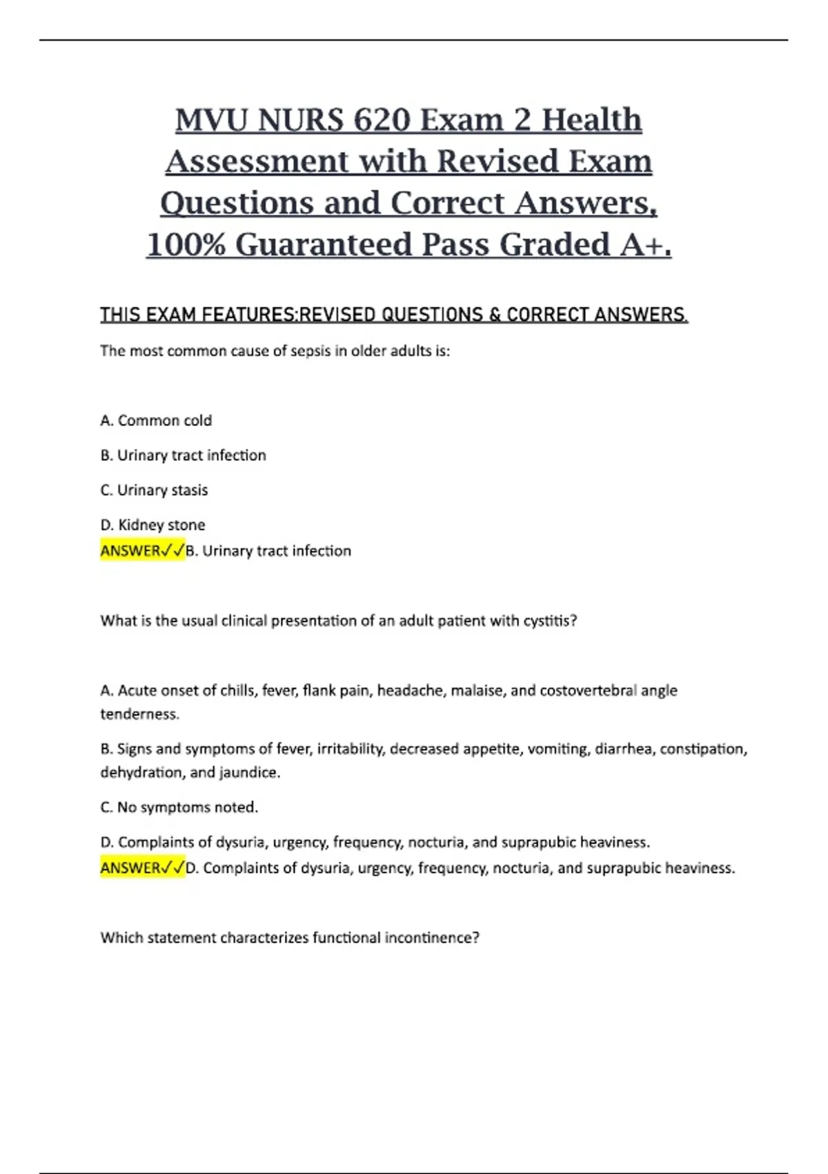 This document provides a fully revised set of Exam 2 questions for MVU NURS 620, paired with accurate and up-to-date correct answers. It covers the key health assessment topics, applied clinical concepts, and intermediate competencies typically evaluated in the second exam of the course. The material is organized to support efficient studying, reinforce core assessment skills, and strengthen exam readiness. Ideal for students looking for a complete and reliable preparation resource.This document provides a fully revised set of Exam 2 questions for MVU NURS 620, paired with accurate and up-to-date correct answers. It covers the key health assessment topics, applied clinical concepts, and intermediate competencies typically evaluated in the second exam of the course. The material is organized to support efficient studying, reinforce core assessment skills, and strengthen exam readiness. Ideal for students looking for a complete and reliable preparation resource.