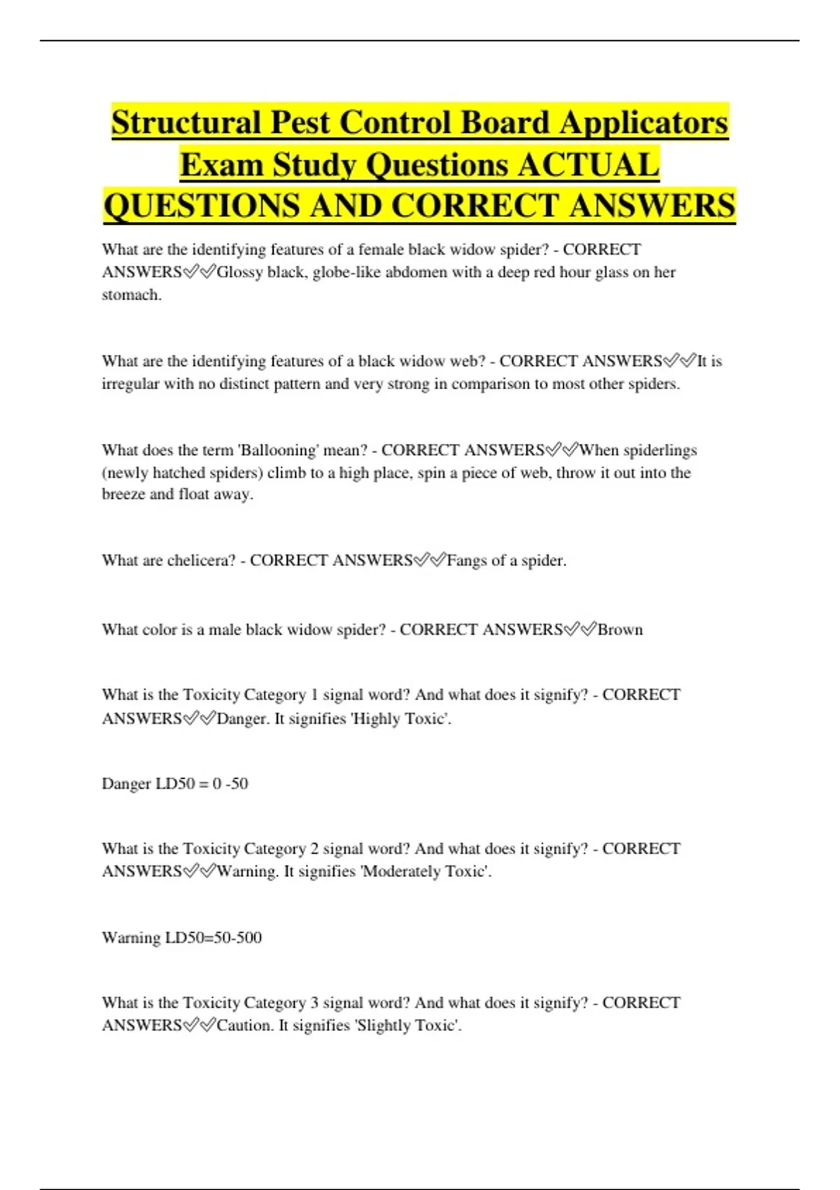 Structural Pest Control Board Applicators Exam Study Questions ACTUAL QUESTIONS AND CORRECT ANSWERS What are the identifying features of a female black widow spider? - CORRECT ANSWERSGlossy black, globe-like abdomen with a deep red hour glass on her stomach. What are the identifying features of a black widow web? - CORRECT ANSWERSIt is irregular with no distinct pattern and very strong in comparison to most other spiders. What does the term 'Ballooning' mean? - CORRECT ANSWERSWhen spiderlings (newly hatched spiders) climb to a high place, spin a piece of web, throw it out into the breeze and float away. What are chelicera? - CORRECT ANSWERSFangs of a spider. What color is a male black widow spider? - CORRECT ANSWERSBrown What is the Toxicity Category 1 signal word? And what does it signify? - CORRECT ANSWERSDanger. It signifies 'Highly Toxic'. Danger LD50 = 0 -50 What is the Toxicity Category 2 signal word? And what does it signify? - CORRECT ANSWERSWarning. It signifies 'Moderately Toxic'. Warning LD50=50-500 What is the Toxicity Category 3 signal word? And what does it signify? - CORRECT ANSWERSCaution. It signifies 'Slightly Toxic'. Caution LD50= 500-5000 What is the Toxicity Category 4 signal word? And what does it signify? - CORRECT ANSWERSNo signal word is required. It signifies 'Relatively Non-toxic'. What are the 11 key parts of a pesticide label? - CORRECT ANSWERS1. Classification of pesticide use 2. Product name 3. Type of formulation 4. Ingredient statement 5. Net contents of container 6. Signal word 7. Name of manufacturing company 8. EPA registration and establishment numbers 9. Directions for use 10. Hazard Statement 11. Storage and disposal information. What species of recluse spider is found in the Southwest? - CORRECT ANSWERSThe Desert Recluse What are the identifying features of a recluse spider? - CORRECT ANSWERSBrown with a violin shape behind its head. Usually found in dark places; wood piles, under rocks, closets and stored boxes. What is the largest native spider in the U.S.? - CORRECT ANSWERSThe Tarantula What does Tarantula mean? - CORRECT ANSWERSBig, hairy spider How does a tarantula live? - CORRECT ANSWERSThey live in burrows or gaps under rocks. They will often utilize an abandoned rodent hole which they will at least partially line with silk. What is the most persistent and troublesome ant that invades houses? - CORRECT