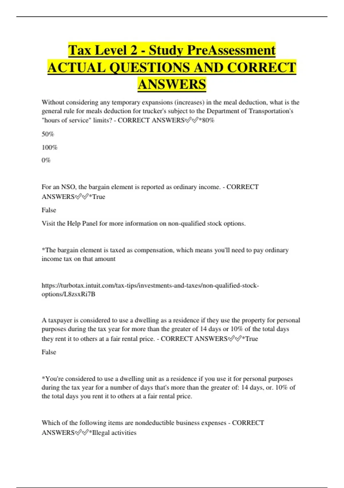 Tax Level 2 - Study PreAssessment ACTUAL QUESTIONS AND CORRECT ANSWERS Without considering any temporary expansions (increases) in the meal deduction, what is the general rule for meals deduction for trucker's subject to the Department of Transportation's "hours of service" limits? - CORRECT ANSWERS*80% 50% 100% 0% For an NSO, the bargain element is reported as ordinary income. - CORRECT ANSWERS*True False Visit the Help Panel for more information on non-qualified stock options. *The bargain element is taxed as compensation, which means you'll need to pay ordinary income tax on that amount options/L8zsxRi7B A taxpayer is considered to use a dwelling as a residence if they use the property for personal purposes during the tax year for more than the greater of 14 days or 10% of the total days they rent it to others at a fair rental price. - CORRECT ANSWERS*True False *You're considered to use a dwelling unit as a residence if you use it for personal purposes during the tax year for a number of days that's more than the greater of: 14 days, or. 10% of the total days you rent it to others at a fair rental price. Which of the following items are nondeductible business expenses - CORRECT ANSWERS*Illegal activities $15 grocery store gift card *Broadway Show *$1,000 gift card *Personal expenses When calculating the depreciable basis of a rental property, the taxpayer should not include the value of the land - CORRECT ANSWERS*True False A Qualified Charitable Distribution can satisfy only part of your required minimum distribution for the year - CORRECT ANSWERSTrue *False Which of the following statements are true? Select all that apply -Traditional IRAs are the same as 401(k)s -There are income limits for Roth IRAs. -Anyone that is working and/or has earned income to contribute to a -Traditional IRA regardless of age -Nondeductible IRA contributions have no income limits - CORRECT ANSWERSSelect all that apply: Traditional IRAs are the same as 401(k)s *There are income limits for Roth IRAs. *Anyone that is working and/or has earned income to contribute to a Traditional IRA