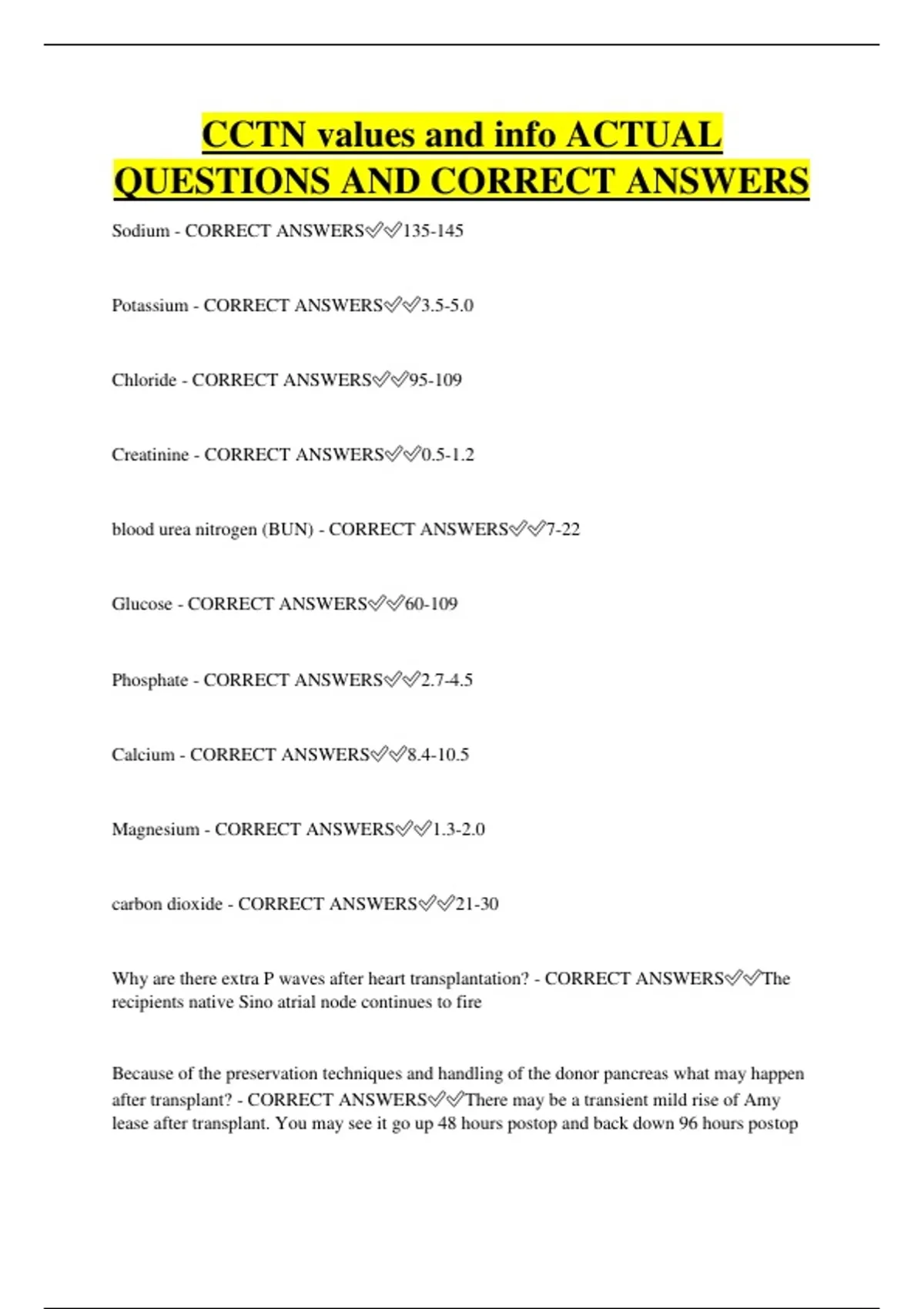CCTN values and info ACTUAL QUESTIONS AND CORRECT ANSWERS Sodium - CORRECT ANSWERS135-145 Potassium - CORRECT ANSWERS3.5-5.0 Chloride - CORRECT ANSWERS95-109 Creatinine - CORRECT ANSWERS0.5-1.2 blood urea nitrogen (BUN) - CORRECT ANSWERS7-22 Glucose - CORRECT ANSWERS60-109 Phosphate - CORRECT ANSWERS2.7-4.5 Calcium - CORRECT ANSWERS8.4-10.5 Magnesium - CORRECT ANSWERS1.3-2.0 carbon dioxide - CORRECT ANSWERS21-30 Why are there extra P waves after heart transplantation? - CORRECT ANSWERSThe recipients native Sino atrial node continues to fire Because of the preservation techniques and handling of the donor pancreas what may happen after transplant? - CORRECT ANSWERSThere may be a transient