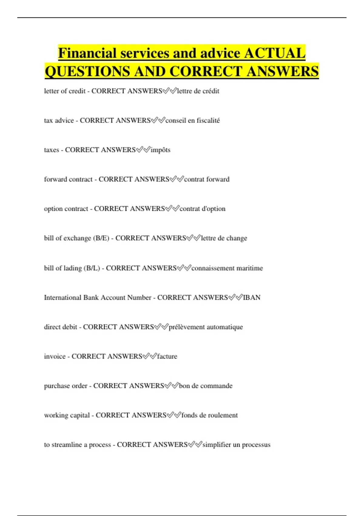 Financial services and advice ACTUAL QUESTIONS AND CORRECT ANSWERS letter of credit - CORRECT ANSWERSlettre de crédit tax advice - CORRECT ANSWERSconseil en fiscalité taxes - CORRECT ANSWERSimpôts forward contract - CORRECT ANSWERScontrat forward option contract - CORRECT ANSWERScontrat d'option bill of exchange (B/E) - CORRECT ANSWERSlettre de change bill of lading (B/L) - CORRECT ANSWERSconnaissement maritime International Bank Account Number - CORRECT ANSWERSIBAN direct debit - CORRECT ANSWERSprélèvement automatique invoice - CORRECT ANSWERSfacture purchase order - CORRECT ANSWERSbon de commande working capital - CORRECT ANSWERSfonds de roulement to streamline a process - CORRECT ANSWERSsimplifie
