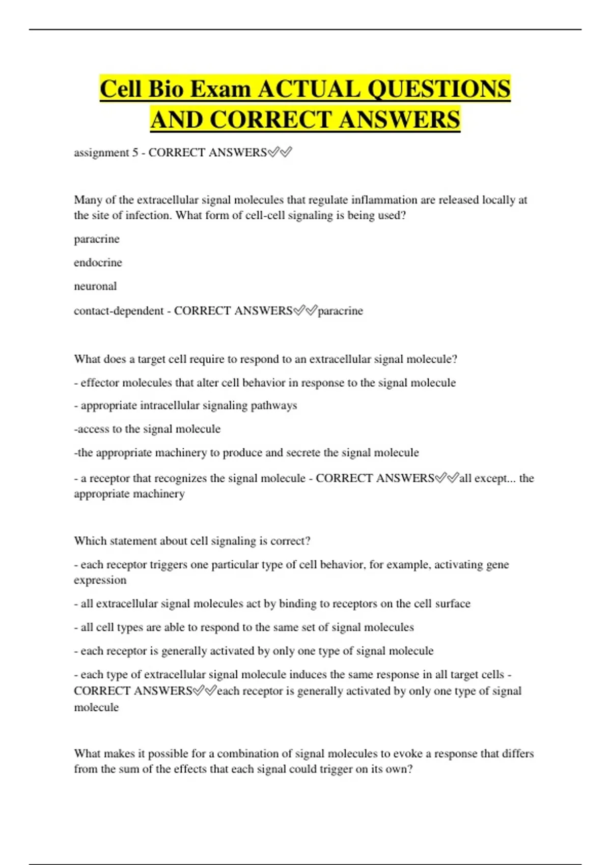 Cell Bio Exam ACTUAL QUESTIONS AND CORRECT ANSWERS assignment 5 - CORRECT ANSWERS Many of the extracellular signal molecules that regulate inflammation are released locally at the site of infection. What form of cell-cell signaling is being used? paracrine endocrine neuronal contact-dependent - CORRECT ANSWERSparacrine What does a target cell require to respond to an extracellular signal molecule? - effector molecules that alter cell behavior in response to the signal molecule - appropriate intracellular signaling pathways -access to the signal molecule -the appropriate machinery to produce and secrete the signal molecule - a receptor that recognizes the signal molecule - CORRECT ANSWERSall except... the appropriate machinery Which statement about cell signaling is correct? - each receptor triggers one particular type of cell behavior, for example, activating gene expression - all extracellular signal molecules act by binding to receptors on the cell surface - all cell types are able to respond to the same set of signal molecules - each receptor is generally activated by only one type of signal molecule - each type of extracellular signal molecule induces the same response in all target cells - CORRECT ANSWERSeach receptor is generally activated by only one type of signal molecule What makes it possible for a combination of signal molecules to evoke a response that differs from the sum of the effects that each signal could trigger on its own? - the tendency of different cells to display different receptors - the ability of different intracellular relay systems to interact - the ability of different signal molecules to bind to the same receptor - the ability of the same signal molecule to bind to different receptors - the ability of different receptors to activate different intracellular relay systems - CORRECT ANSWERSthe ability of different intracellular relay systems to interact Under what condition will a target cell always respond quickly to an ext