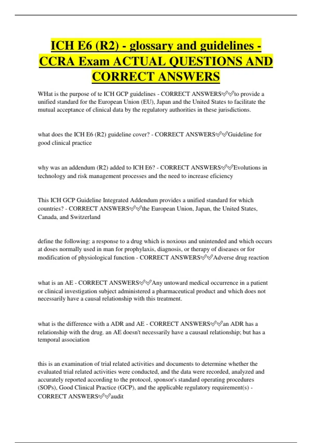 ICH E6 (R2) - glossary and guidelines CCRA Exam ACTUAL QUESTIONS AND CORRECT ANSWERS WHat is the purpose of te ICH GCP guidelines - CORRECT ANSWERSto provide a unified standard for the European Union (EU), Japan and the United States to facilitate the mutual acceptance of clinical data by the regulatory authorities in these jurisdictions. what does the ICH E6 (R2) guideline cover? - CORRECT ANSWERSGuideline for good clinical practice why was an addendum (R2) added to ICH E6? - CORRECT ANSWERSEvolutions in technology and risk management processes and the need to increase eficiency This ICH GCP Guideline Integrated Addendum provides a unified standard for which countries? - CORRECT ANSWERSthe European Union, Japan, the United States, Canada, and Switzerland define the following: a response to a drug which is noxious and unintended and which occurs at doses normally used in man for prophylaxis, diagnosis, or therapy of diseases or for modification of physiological function - CORRECT ANSWERSAdverse drug reaction what is an AE - CORRECT ANSWERSAny untoward medical occurrence in a patient or clinical investigation subject administered a pharmaceutical product and which does not necessarily have a causal relationship with this treatment. what is the difference with a ADR and AE - CORRECT ANSWERSan ADR has a relationship with the drug. an AE doesn't necessarily have a causaul relationship; but has a temporal association this is an examination of trial related activities and documents to determine whether