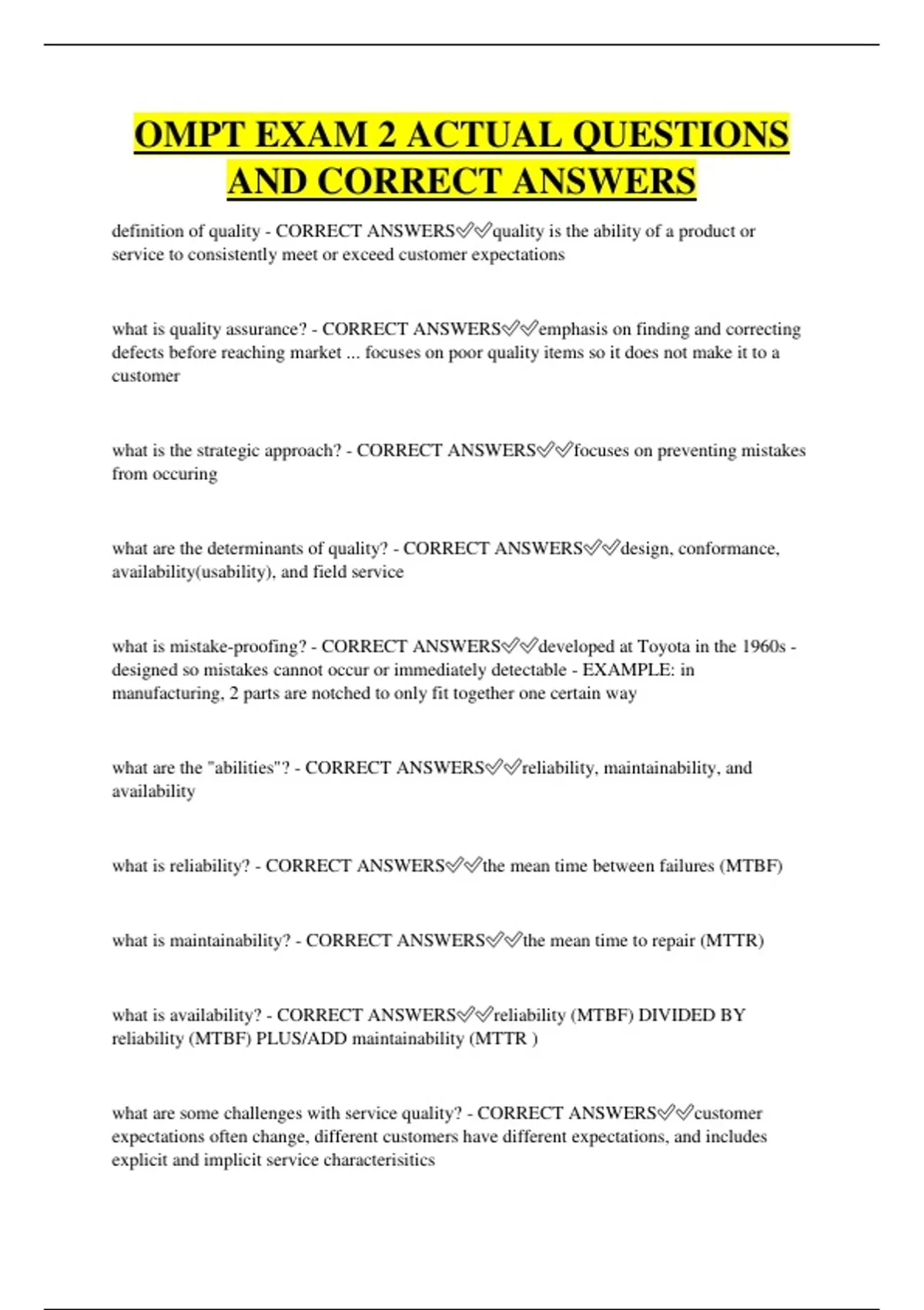 OMPT EXAM 2 ACTUAL QUESTIONS AND CORRECT ANSWERS definition of quality - CORRECT ANSWERSquality is the ability of a product or service to consistently meet or exceed customer expectations what is quality assurance? - CORRECT ANSWERSemphasis on finding and correcting defects before reaching market ... focuses on poor quality items so it does not make it to a customer what is the strategic approach? - CORRECT ANSWERSfocuses on preventing mistakes from occuring what are the determinants of quality? - CORRECT ANSWERSdesign, conformance, availability(usability), and field service what is mistake-proofing? - CORRECT ANSWERSdeveloped at Toyota in the 1960s - designed so mistakes cannot occur or immediately detectable - EXAMPLE: in manufacturing, 2 parts are notched to only fit together one certain way what are the "abilities"? - CORRECT ANSWERSreliability, maintainability, and availability what is reliability? - CORRECT ANSWERSthe mean time between failures (MTBF) what is maintainability? - CORRECT ANSWERSthe mean time to repair (MTTR) what is availability? - CORRECT ANSWERSreliability (MTBF) DIVIDED BY reliability (MTBF) PLUS/ADD maintainability (MTTR ) what are some challenges with service quality? - CORRECT ANSWERScustomer expectations often change, different customers have different expectations, and includes explicit and implicit service characterisitics what is the supplier role in quality? - CORRECT ANSWERSinvolve in pr