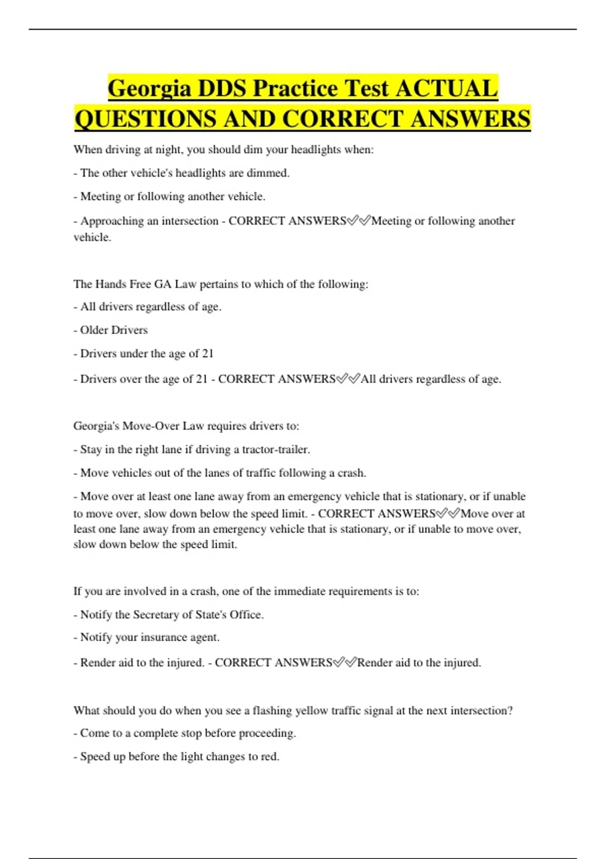 Georgia DDS Practice Test ACTUAL QUESTIONS AND CORRECT ANSWERS When driving at night, you should dim your headlights when: - The other vehicle's headlights are dimmed. - Meeting or following another vehicle. - Approaching an intersection - CORRECT ANSWERSMeeting or following another vehicle. The Hands Free GA Law pertains to which of the following: - All drivers regardless of age. - Older Drivers - Drivers under the age of 21 - Drivers over the age of 21 - CORRECT ANSWERSAll drivers regardless of age. Georgia's Move-Over Law requires drivers to: - Stay in the right lane if driving a tractor-trailer. - Move vehicles out of the lanes of traffic following a crash. - Move over at least one lane away from an emergency vehicle that is stationary, or if unable to move over, slow down below the speed limit. - CORRECT ANSWERSMove over at least one lane away from an emergency vehicle that is stationary, or if unable to move over, slow down below the speed limit. If you are involved in a crash, one of the immediate requirements is to: - Notify the Secretary of State's Office. - Notify your insurance agent. - Render aid to the injured. - CORRECT ANSWERSRender aid to the injured. What should you do when you see a flashing yellow traffic signal at the next intersection? - Come to a complete stop before proceeding. - Speed up before the light changes to red. - Slow down and proceed with caution. - CORRECT ANSWERSSlow down and proceed with caution. Where does the licensed driver riding with a permit holder need to ride in the vehicle? - In the front passenger seat. - In the backseat directly behind the driver. - Anywhere they choose. - CORRECT ANSWERSIn the front passenge