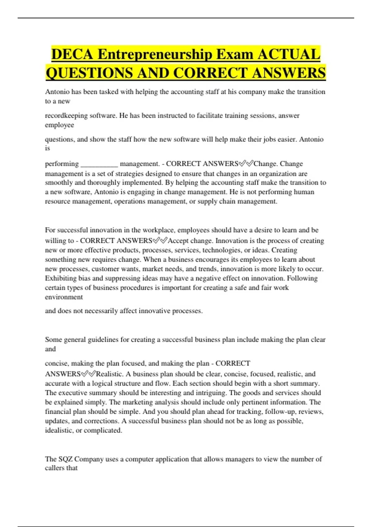 ANSWERS✅✅Realistic. A business plan should be clear, concise, focused, realistic, and