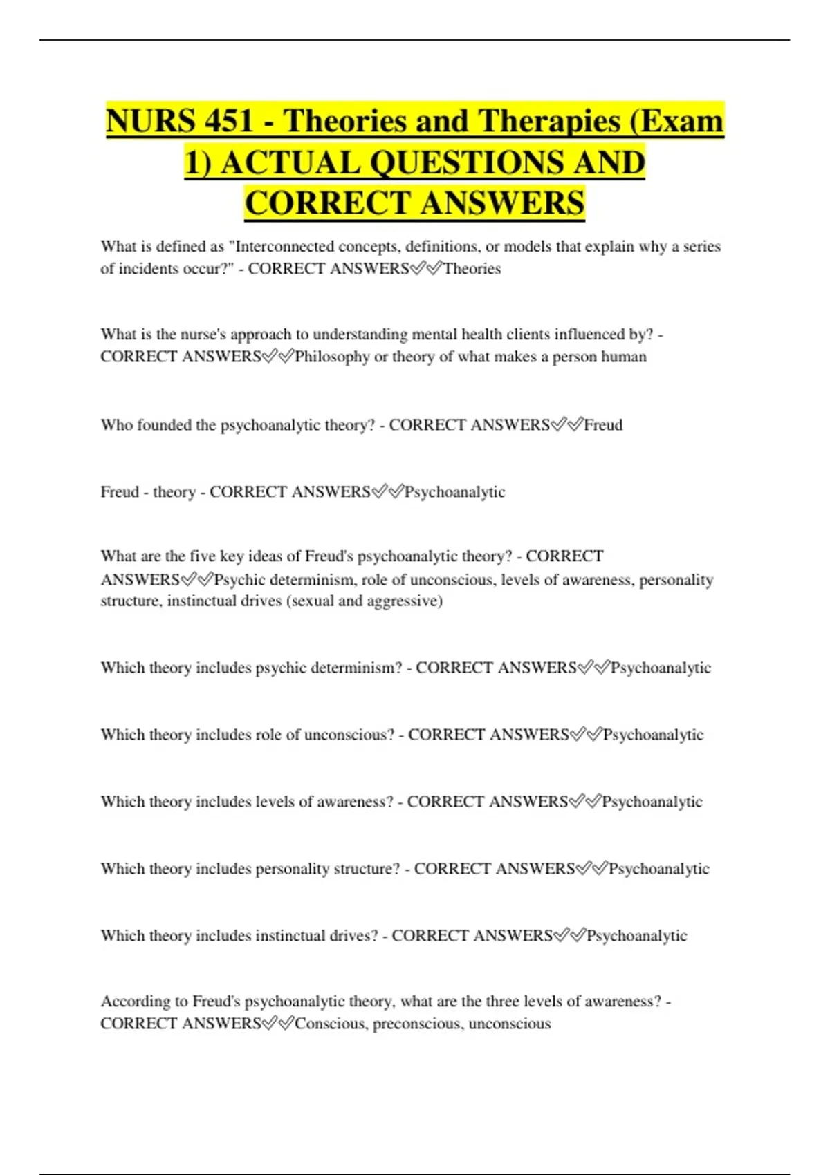 CORRECT ANSWERS✅✅Conscious, preconscious, unconscious