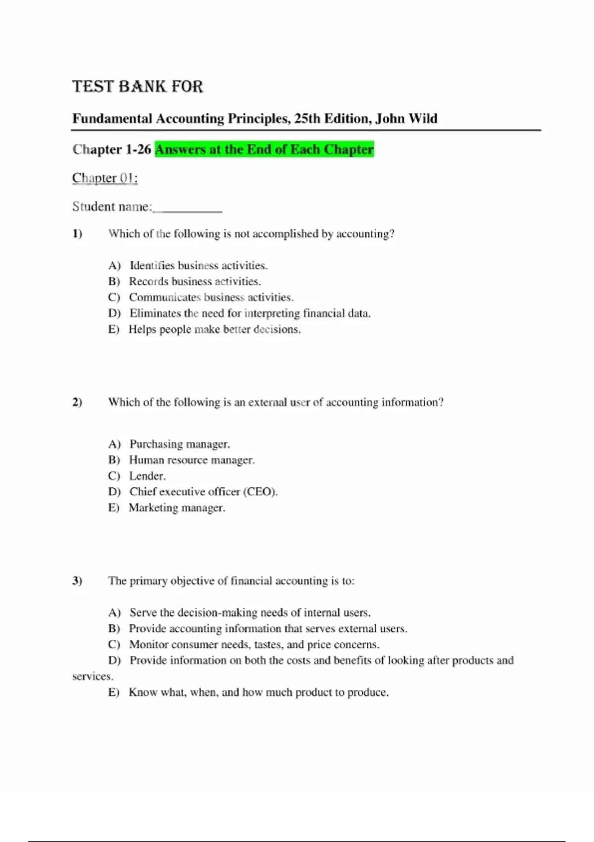This document provides the complete test bank for Fundamental Accounting Principles (25th Edition) by John Wild, Ken Shaw, and Kermit Larson. It includes over 200 multiple-choice and true/false questions per chapter, with answers provided at the end of each section. The content covers foundational accounting concepts such as the accounting equation, financial statements, internal controls, merchandising operations, adjusting entries, inventories, receivables, liabilities, equity, and cash flow statements. Ideal for students and instructors in introductory accounting courses, this resource supports exam preparation, quizzes, and in-class assessments.