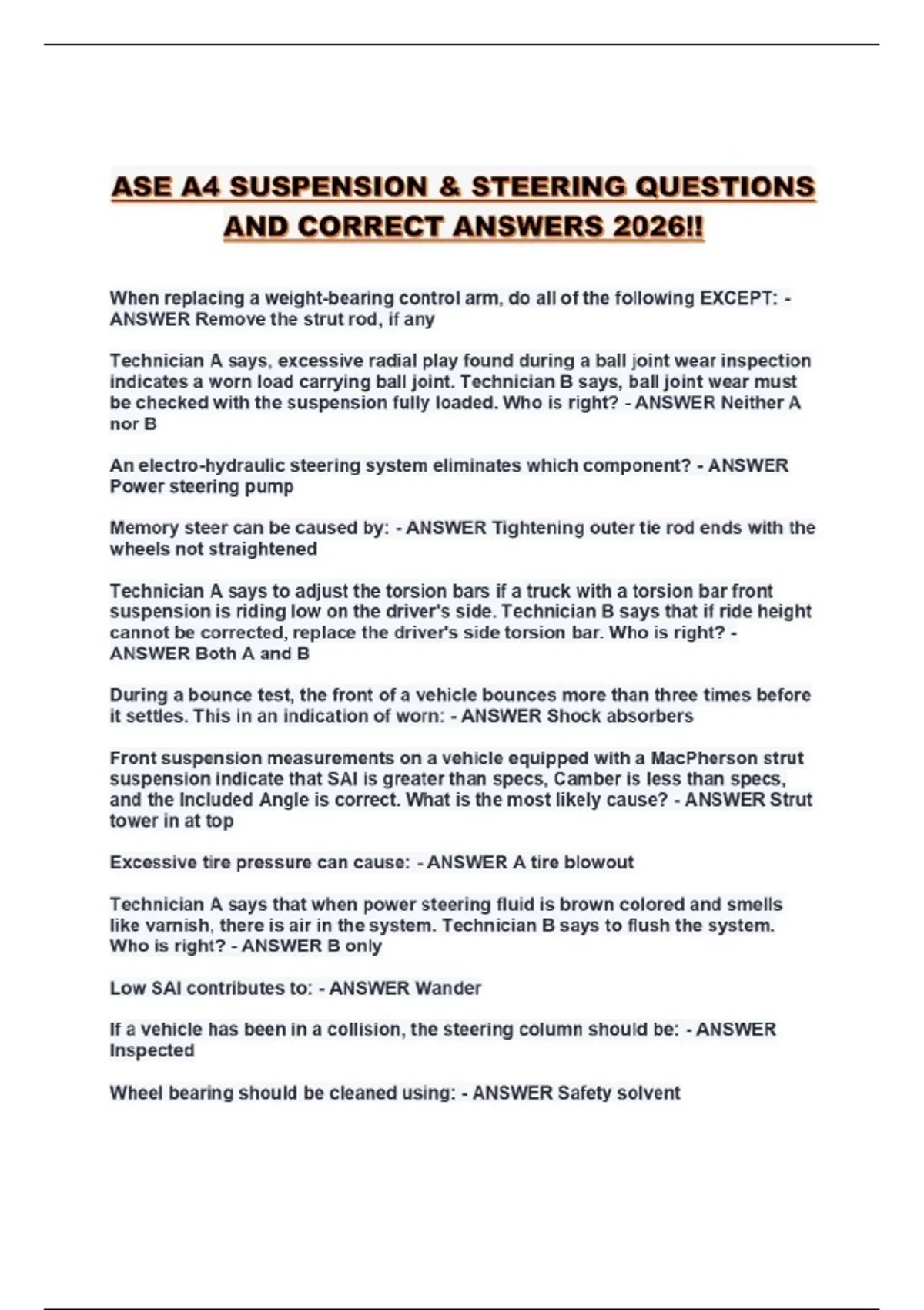 ASE A4 SUSPENSION & STEERING QUESTIONS AND CORRECT ANSWERS 2026!!...