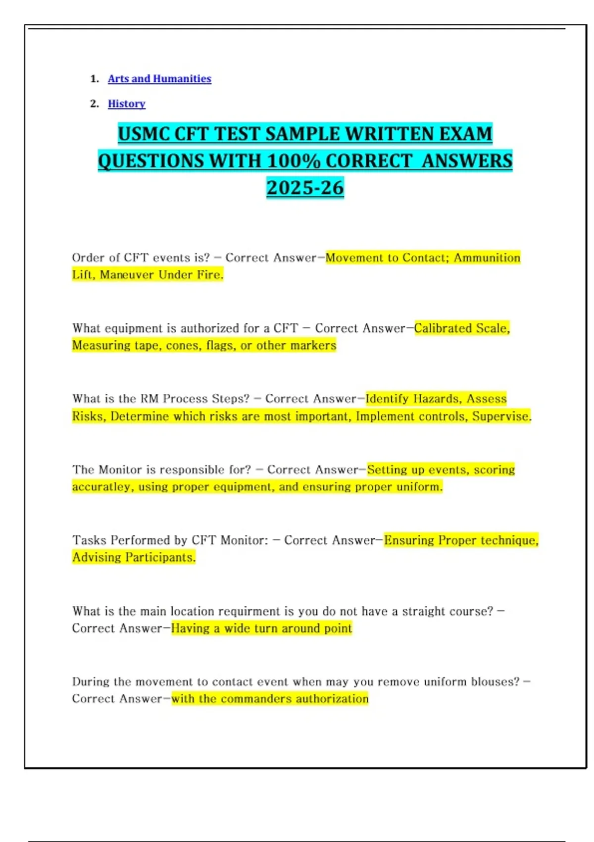 USMC CFT TEST SAMPLE WRITTEN EXAM QUESTIONS WITH 100% CORRECT ANSWERS 2025-26