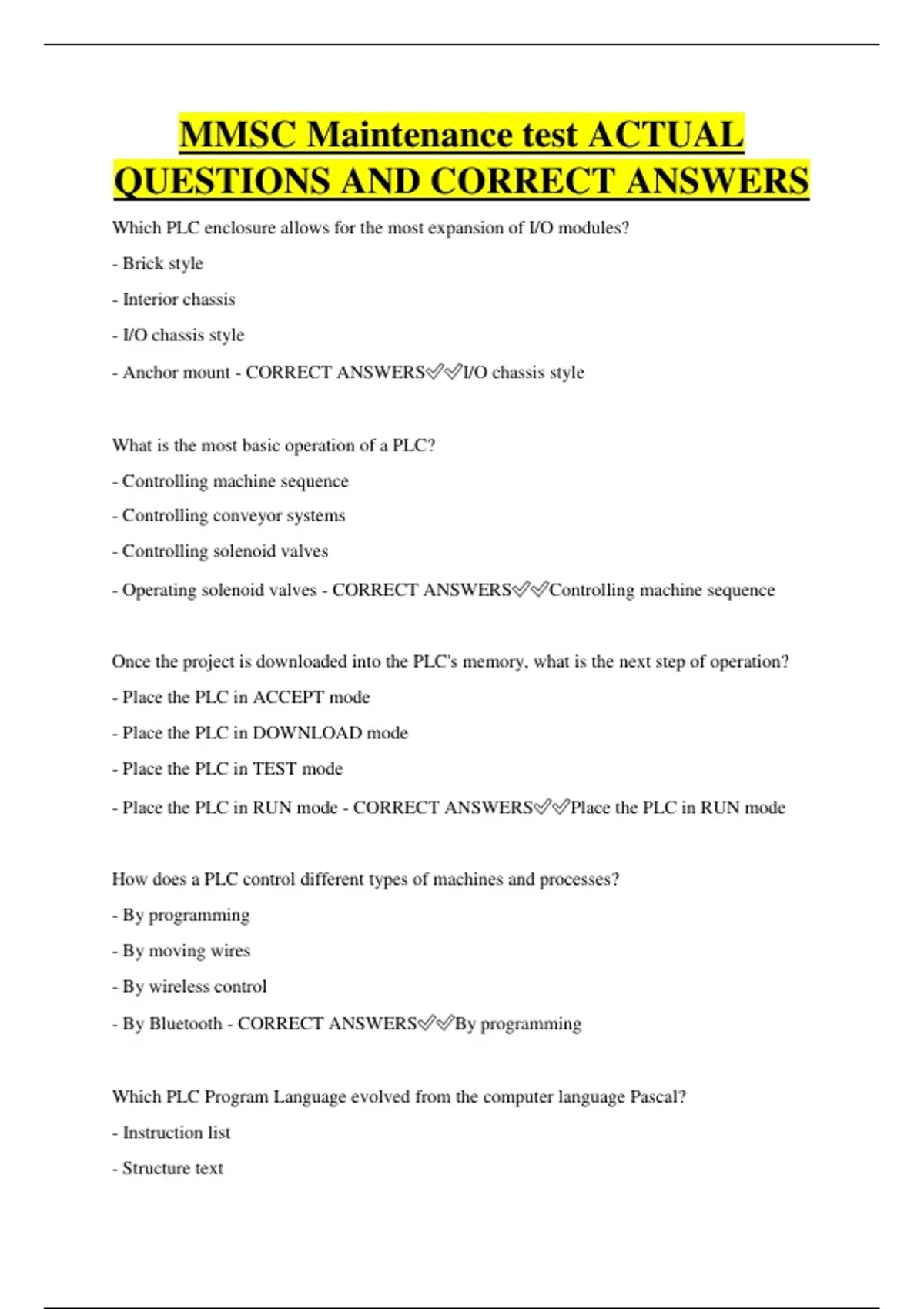 MMSC Maintenance test ACTUAL QUESTIONS AND CORRECT ANSWERS Which PLC enclosure allows for the most expansion of I/O modules? - Brick style - Interior chassis - I/O chassis style - Anchor mount - CORRECT ANSWERSI/O chassis style What is the most basic operation of a PLC? - Controlling machine sequence - Controlling conveyor systems - Controlling solenoid valves - Operating solenoid valves - CORRECT ANSWERSControlling machine sequence Once the project is downloaded into the PLC's memory, what is the next step of operation? - Place the PLC in ACCEPT mode - Place the PLC in DOWNLOAD mode - Place the PLC in TEST mode - Place the PLC in RUN mode - CORRECT ANSWERSPlace the PLC in RUN mode How does a PLC control different types of machines and processes? - By programming - By moving wires - By wireless control - By Bluetooth - CORRECT ANSWERSBy programming Which PLC Program Language evolved from the computer language Pascal? - Instruction list - Structure text - Sequential Function Chart - Ladder Logic - CORRECT ANSWERSStructure text PLC executes a 3-step process called scan cycle. Scan cycle includes Input scan and Output scan, what is the third step? - Process scan - Program scan - Feedback scan - Message scan - CORRECT ANSWERSProgram scan A PLC is classified by their enclosure. What is the other enclosure besides I/O ch