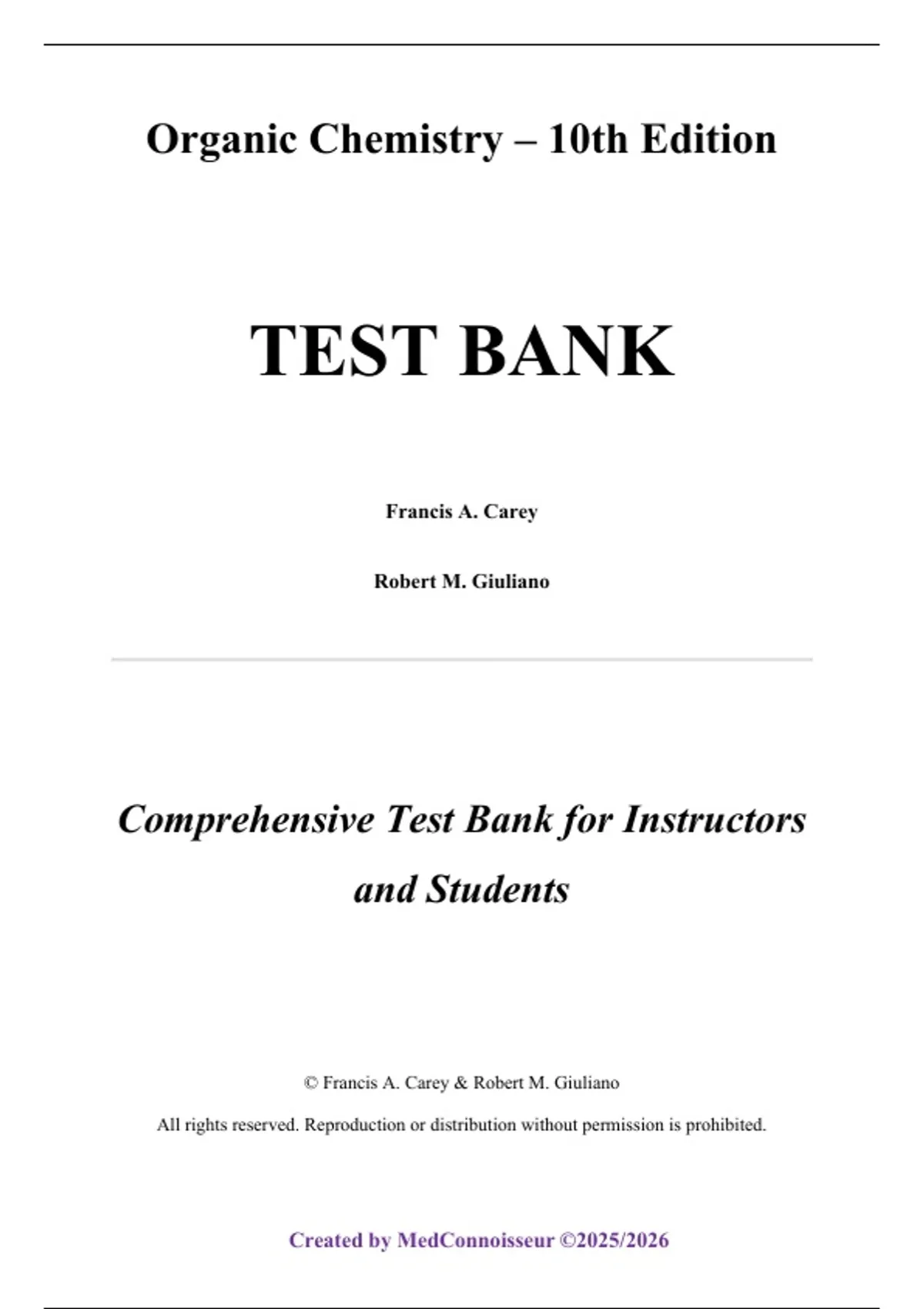 The Test Bank for Organic Chemistry, 10th Edition by Francis A. Carey and Robert M. Giuliano delivers a fully verified and comprehensive collection of assessment questions aligned with the official McGraw-Hill edition. This test bank includes multiple-choice, true/false, short-answer, reaction-mechanism, synthesis planning, and spectral-interpretation problems matched to each chapter’s learning objectives. It is designed for instructors to build quizzes, midterms, finals, and homework assessments with confidence in coverage and consistency. All the Chapters include: Chapter 1: Structure Determines Properties, Chapter 2: Alkanes and Cycloalkanes: Introduction to Hydrocarbons, Chapter 3: Alkanes and Cycloalkanes: Conformations and cis–trans Stereoisomers, Chapter 4: Chirality, Chapter 5: Alcohols and Alkyl Halides: Introduction to Reaction Mechanisms, Chapter 6: Nucleophilic Substitution, Chapter 7: Structure and Preparation of Alkenes: Elimination Reactions, Chapter 8: Addition Reactions of Alkenes, Chapter 9: Alkynes, Chapter 10: Introduction to Free Radicals, Chapter 11: Conjugation in Alkadienes and Allylic Systems, Chapter 12: Arenes and Aromaticity, Chapter 13: Electrophilic and Nucleophilic Aromatic Substitution, Chapter 14: Spectroscopy, Chapter 15: Organometallic Compounds, Chapter 16: Alcohols, Diols, and Thiols, Chapter 17: Ethers, Epoxides, and Sulfides, Chapter 18: Aldehydes and Ketones: Nucleophilic Addition to the Carbonyl Group, Chapter 19: Carboxylic Acids, Chapter 20: Carboxylic Acid Derivatives: Nucleophilic Acyl Substitution, Chapter 21: Enols and Enolates, Chapter 22: Amines, Chapter 23: Phenols, Chapter 24: Carbohydrates, Chapter 25: Lipids, Chapter 26: Amino Acids, Peptides, and Proteins, Chapter 27: Nucleosides, Nucleotides, and Nucleic Acids, Chapter 28: Synthetic Polymers