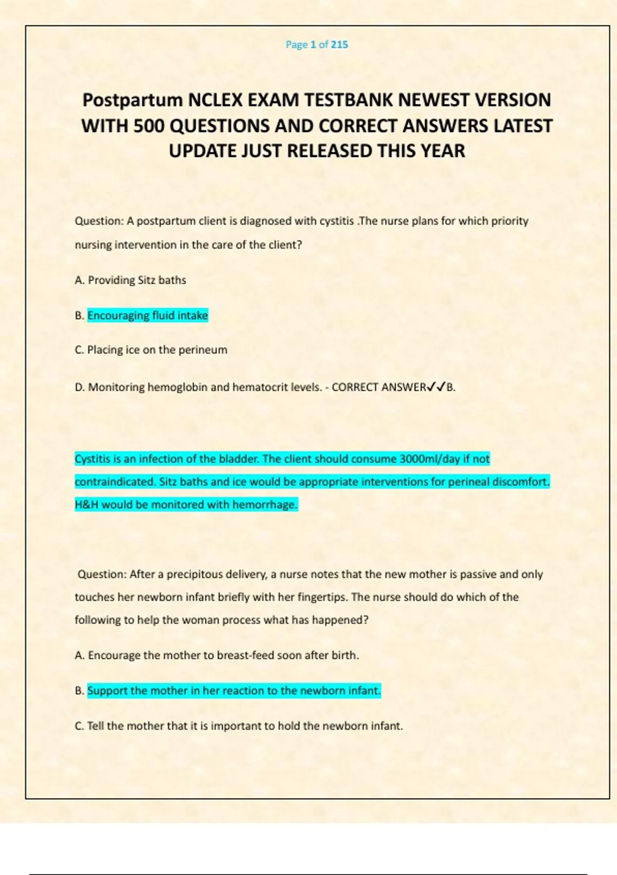 Postpartum NCLEX EXAM TESTBANK NEWEST VERSION WITH 500 QUESTIONS AND CORRECT ANSWERS LATEST UPDATE JUST RELEASED THIS YEAR