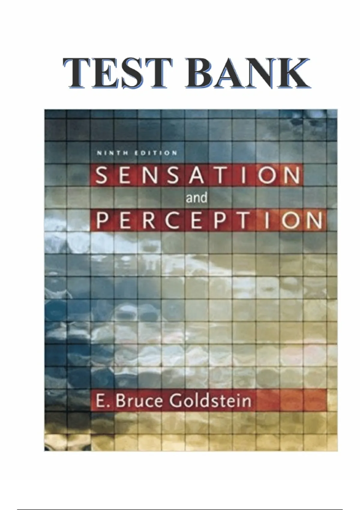 This document provides the comprehensive test bank for Sensation and Perception (9th Edition) by E. Bruce Goldstein. It includes hundreds of chapter-aligned multiple-choice and essay questions with detailed answer keys and references. Topics span the full scope of the book, such as perceptual processes, neural mechanisms, vision and hearing, tactile and chemical senses, perceptual development, and perceptual illusions. This test bank is ideal for instructors, exam preparation, or psychology students mastering sensory systems and perception theory. Content 1. Introduction to Perception. 2. The Physiological Beginnings of Perception. 3. Neural Processing and Coding. 4. Cortical Organization. 5. Perceiving Objects and Scenes. 6. Visual Attention. 7. Taking Action. 8. Perceiving Motion. 9. Perceiving Color. 10. Perceiving Depth and Size. 11. Sound and the Perception of Pitch. 12. Auditory Localization, the Auditory Scene, and Music. 13. Speech Perception. 14. The Cutaneous Senses. 15. The Chemical Senses.