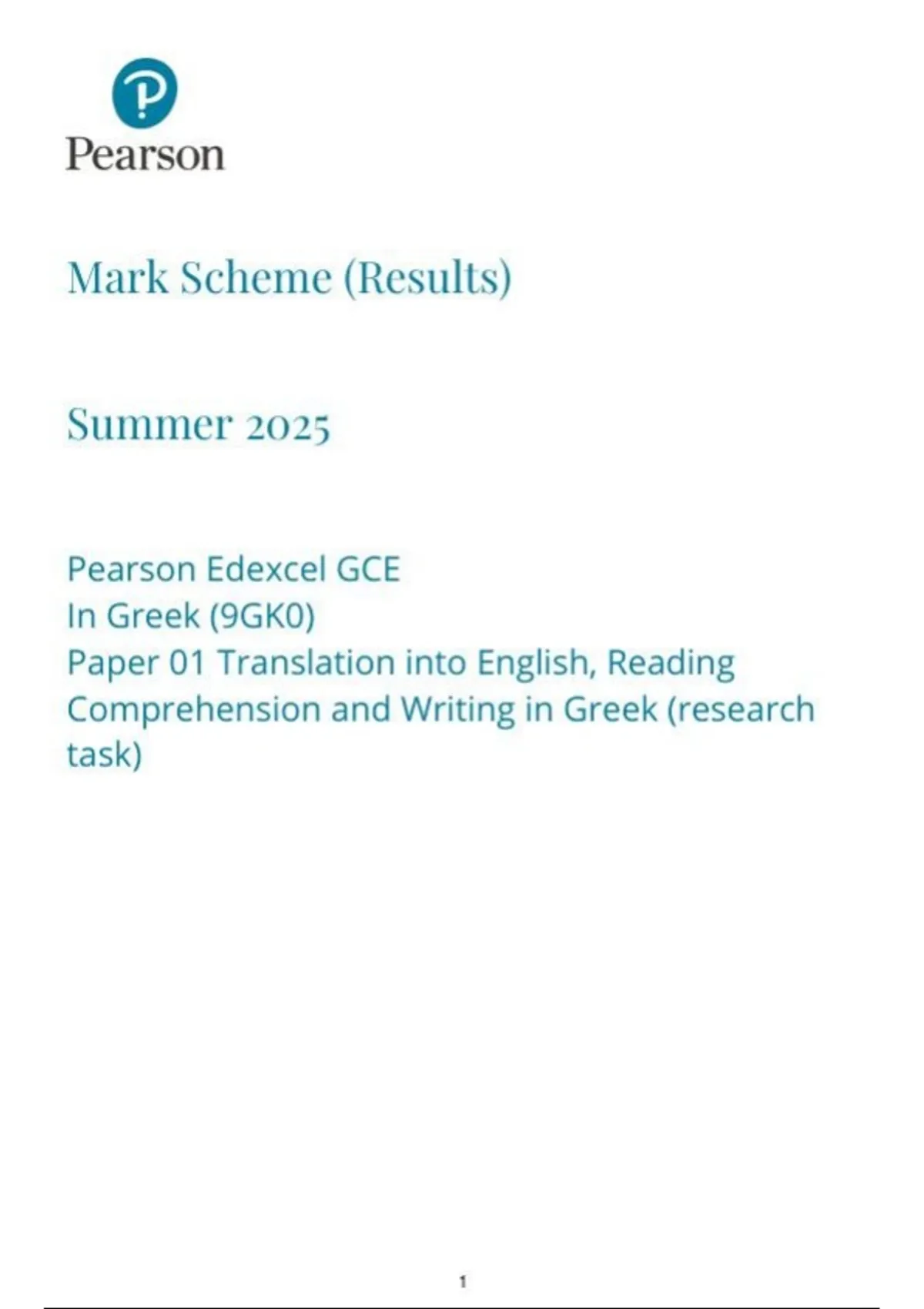 Pearson Edexcel a level Greek | final mark scheme | 2025| 9GK0/01
