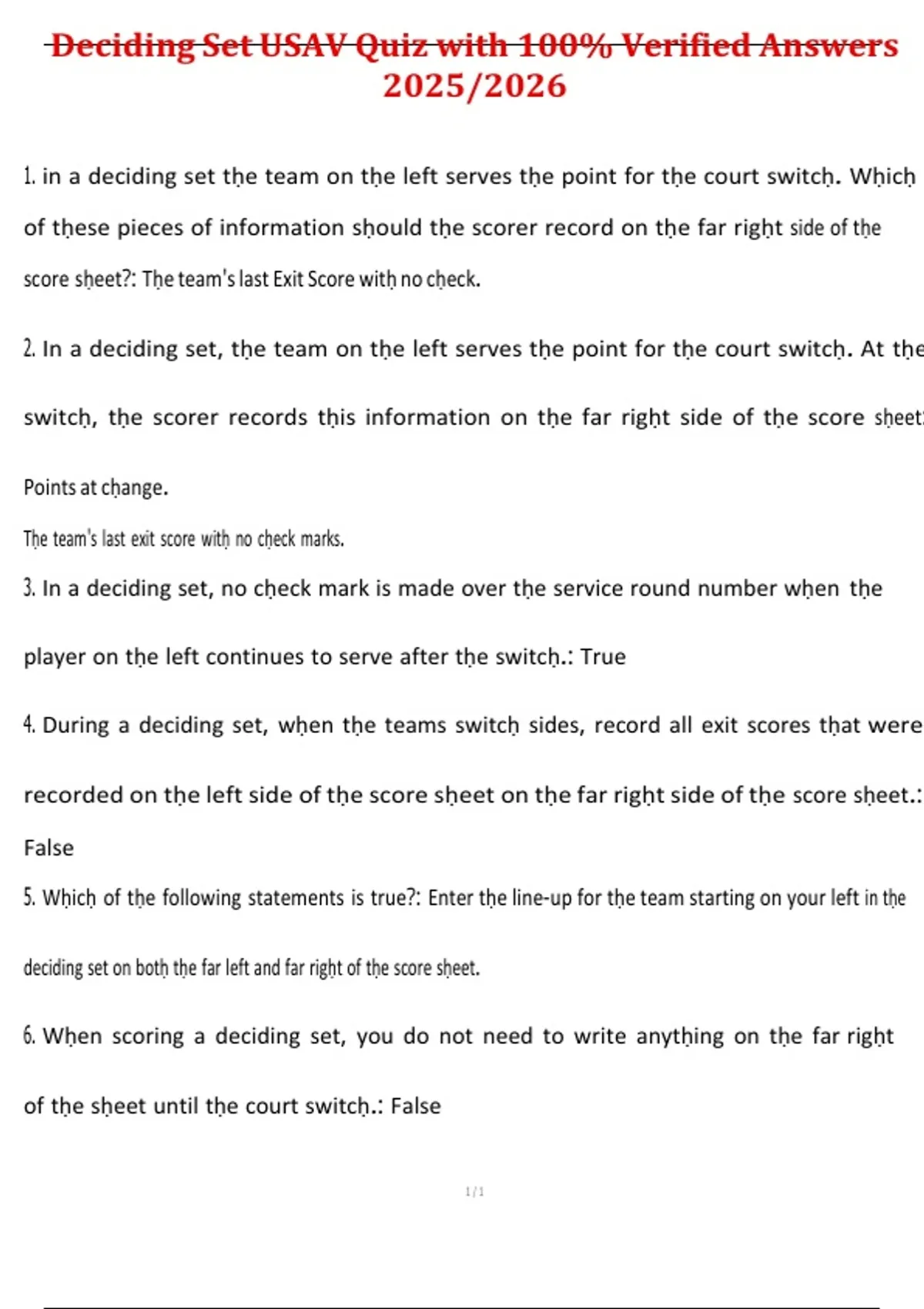 This document contains a complete USAV Deciding Set quiz with 100% verified correct answers, updated for the 2025/2026 certification period. It covers all scoring and procedural requirements specific to a deciding set, including court switching, lineup verification, tracking points, substitutions, libero actions, sanctions, and proper score sheet notation. Aligned with current USA Volleyball guidelines, this resource provides clear and accurate preparation for scorers handling deciding-set responsibilities.