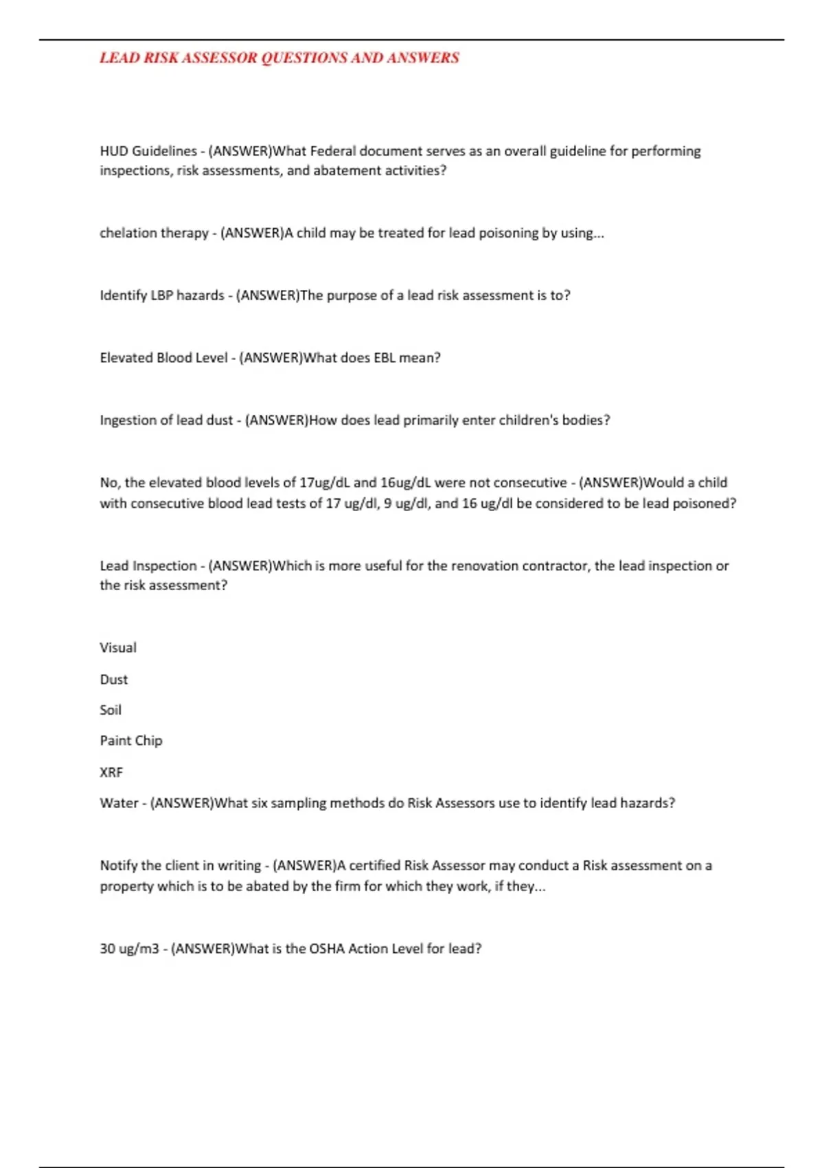 LEAD RISK ASSESSOR QUESTIONS AND ANSWERS