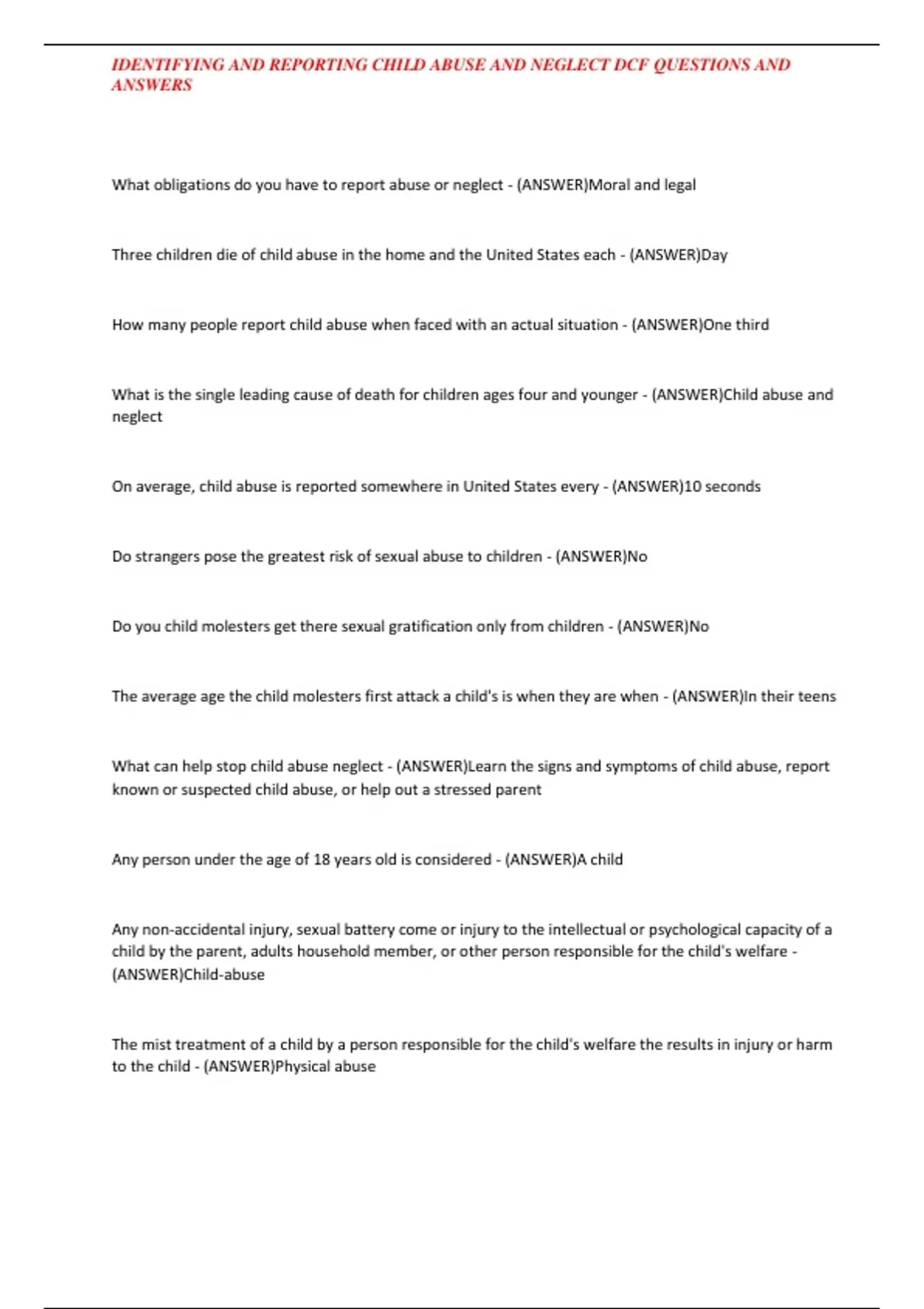 , IDENTIFYING AND REPORTING CHILD ABUSE AND NEGLECT DCF QUESTIONS AND