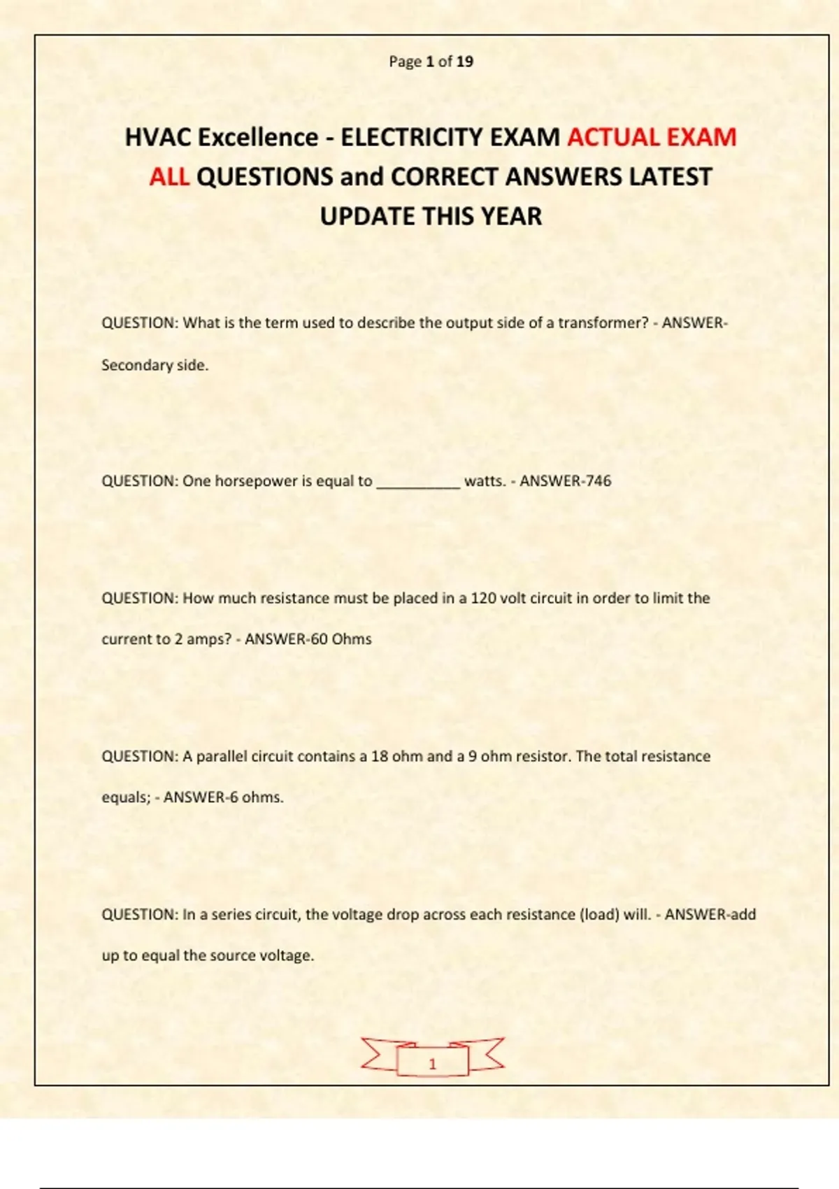 HVAC Excellence - ELECTRICITY EXAM ACTUAL EXAM ALL QUESTIONS and CORRECT ANSWERS LATEST UPDATE THIS YEAR