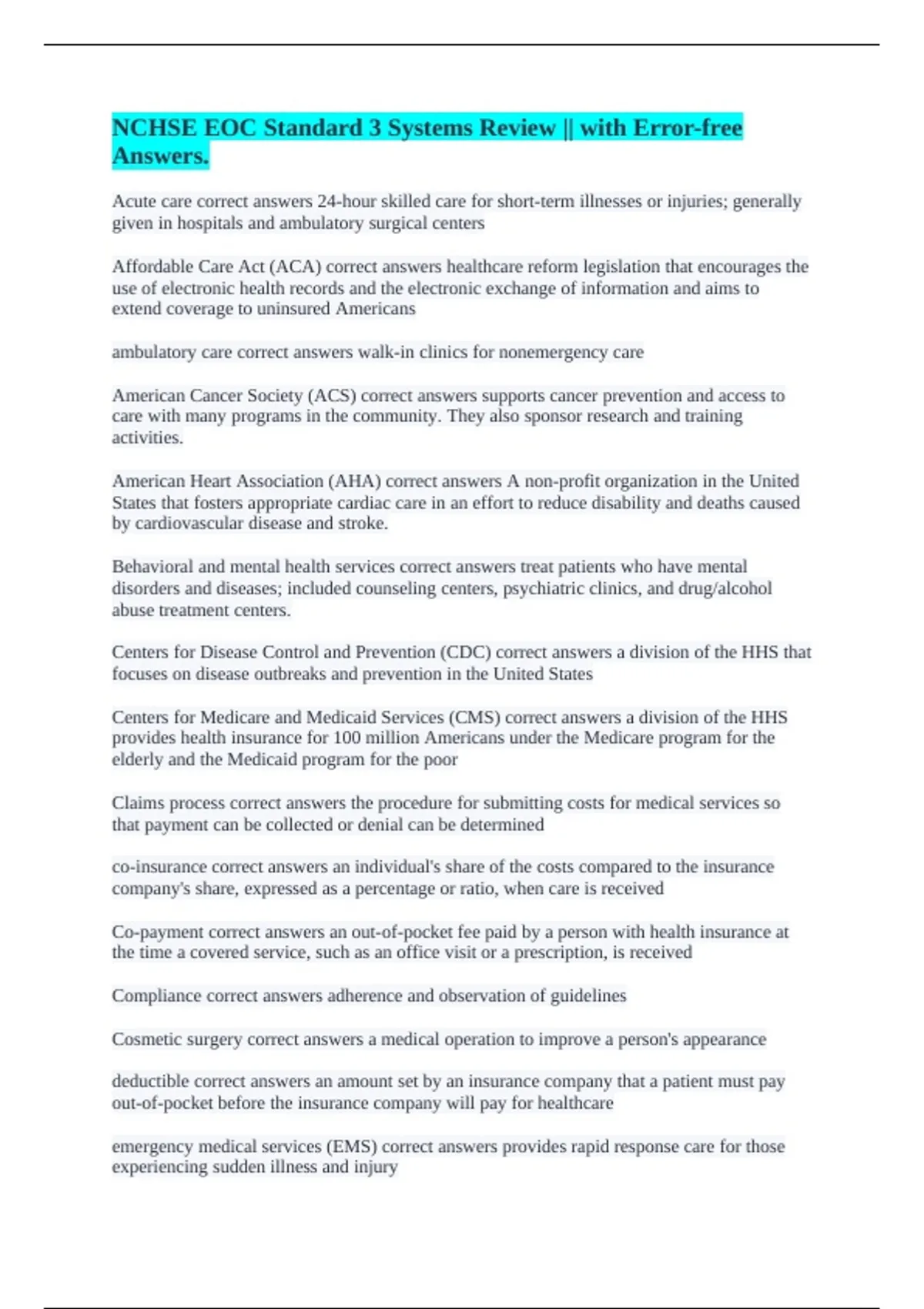 Affordable Care Act (ACA) correct answers healthcare reform legislation that encourages the