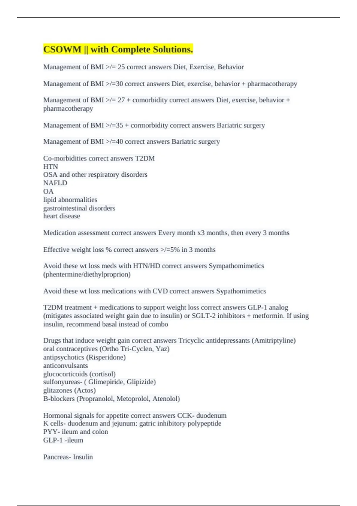 Management of BMI >/= 27 + comorbidity correct answers Diet, exercise, behavior +