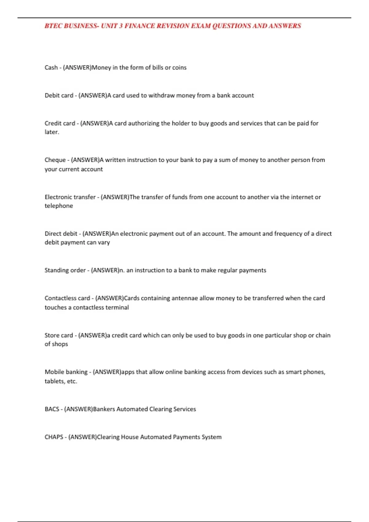 BTEC BUSINESS- UNIT 3 FINANCE REVISION EXAM QUESTIONS AND ANSWERS