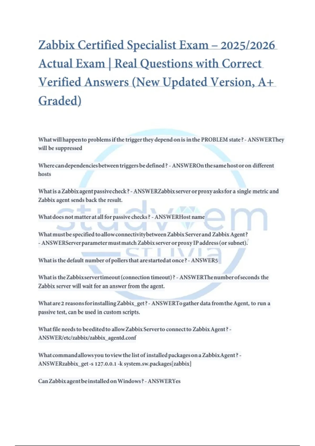 This document contains the newly updated 2025–2026 version of the Zabbix Certified Specialist Exam, featuring real exam-style questions with fully verified and correct answers. It covers all essential Zabbix specialist competencies, including item and host configuration, triggers and events, templates, graphs and dashboards, user roles and permissions, problem detection, notifications, and advanced monitoring functions. The material is designed to support complete certification preparation with clear, accurate explanations aligned to the latest Zabbix platform updates.