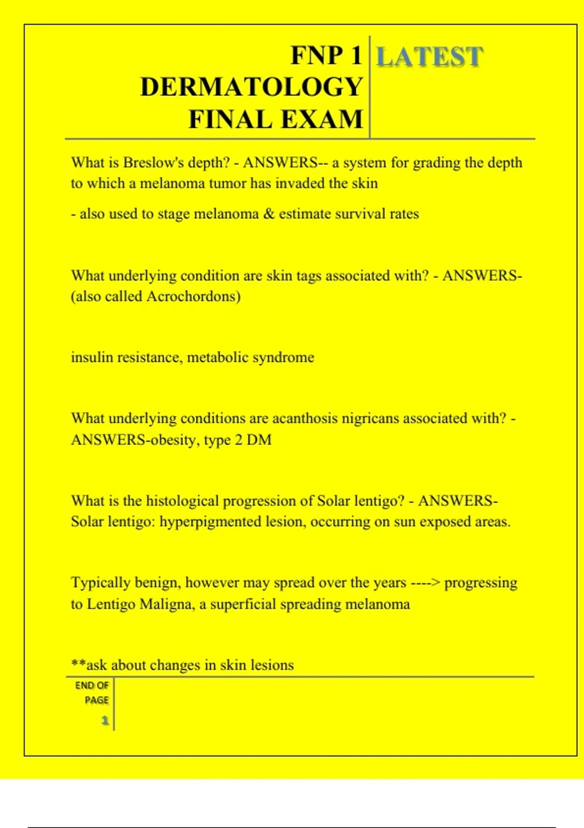 FNP 1 DERMATOLOGY FINAL EXAM QUESTIONS AND ANSWERS 2026