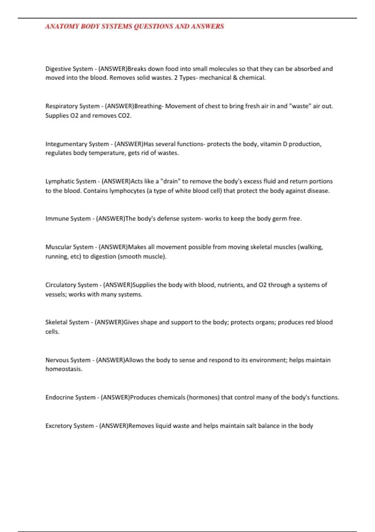 ANATOMY BODY SYSTEMS QUESTIONS AND ANSWERS