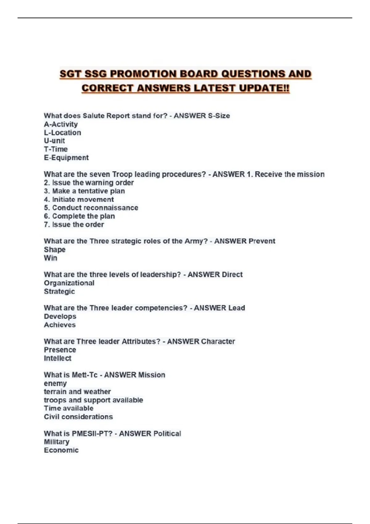 SGT SSG PROMOTION BOARD QUESTIONS AND CORRECT ANSWERS LATEST UPDATE!!